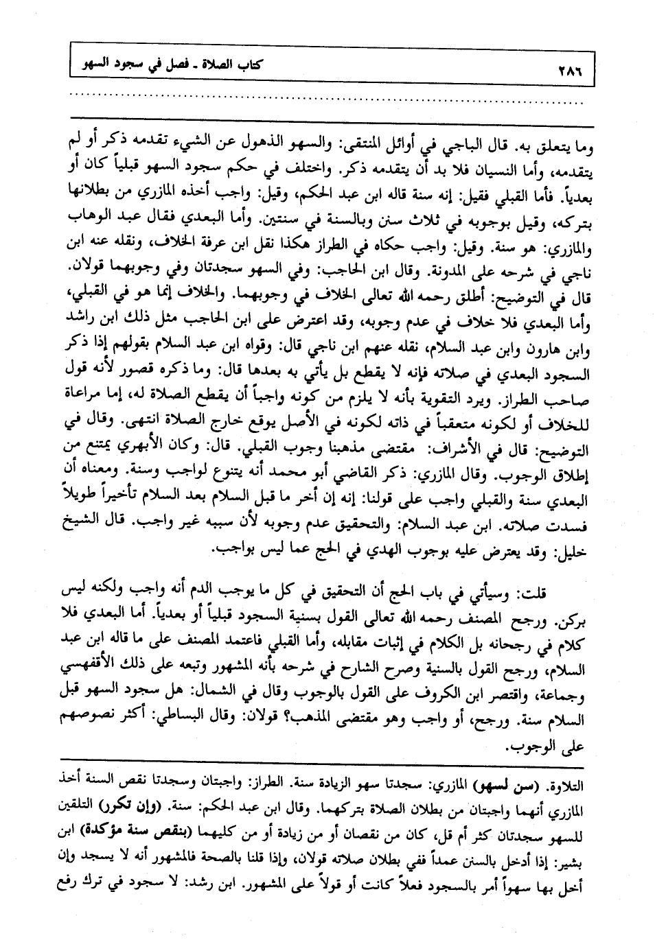 وما يتعلق به قال الباجي في أوائل المنتقى والسهو والذهول عن الشيء تقدمه ذكر أو لم يتقدمه وأما النسيان فلا بد أن يتقدمه ذكر واختلف في حكم سجود السهو قبليا كان أو بعديا فأما القبلي فقيل إنه سنة قاله ابن عبد الحكم وقيل واجب أخذه المازري من بطلانها بتركه وقيل بوجوبه في ثلاث سنن وبالسنة في سنتين, وأما البعدي فقال عبد الوهاب والمازري هو سنة وقيل واجب حكاه في الطراز هكذا نقل ابن عرفة الخلاف ونقله عنه ابن ناجي في شرحه على المدونة وقال ابن الحاجب وفي السهو سجدتان وفي وجوبهما قولان قال في التوضيح أطلق رحمه الله تعالى الخلاف في وجوبهما والخلاف إنما هو في القبلي وأما البعدي فلا خلاف في عدم وجوبه وقد اعترض على ابن الحاجب مثل ذلك ابن راشد وابن هارون وابن عبد السلام نقله عنهم ابن ناجي قال وقواه ابن عبد السلام بقولهم إذا ذكر السجود البعدي في صلاته فإنه لا يقطع بل يأتي به بعدها قال وما ذكره قصور ; لأنه قول صاحب الطراز ويرد التقوية بأنه لا يلزم من كونه واجبا أن يقطع الصلاة له إما مراعاة للخلاف أو لكونه متعقبا في ذاته لكونه في الأصل يوقع خارج الصلاة, انتهى. وقال في التوضيح: قال في الأشراف: مقتضى مذهبنا وجوب القبلي قال وكان الأبهري يمتنع من إطلاق الوجوب وقال المازري ذكر القاضي أبو محمد أنه يتنوع لواجب وسنة ومعناه أن البعدي سنة والقبلي واجب على قولنا إنه إن أخر ما قبل السلام بعد السلام تأخيرا طويلا فسدت صلاته ابن عبد السلام والتحقيق عدم وجوبه ; لأن سببه غير واجب, قال الشيخ خليل: وقد يعترض عليه بوجوب الهدي في الحج عما ليس بواجب.