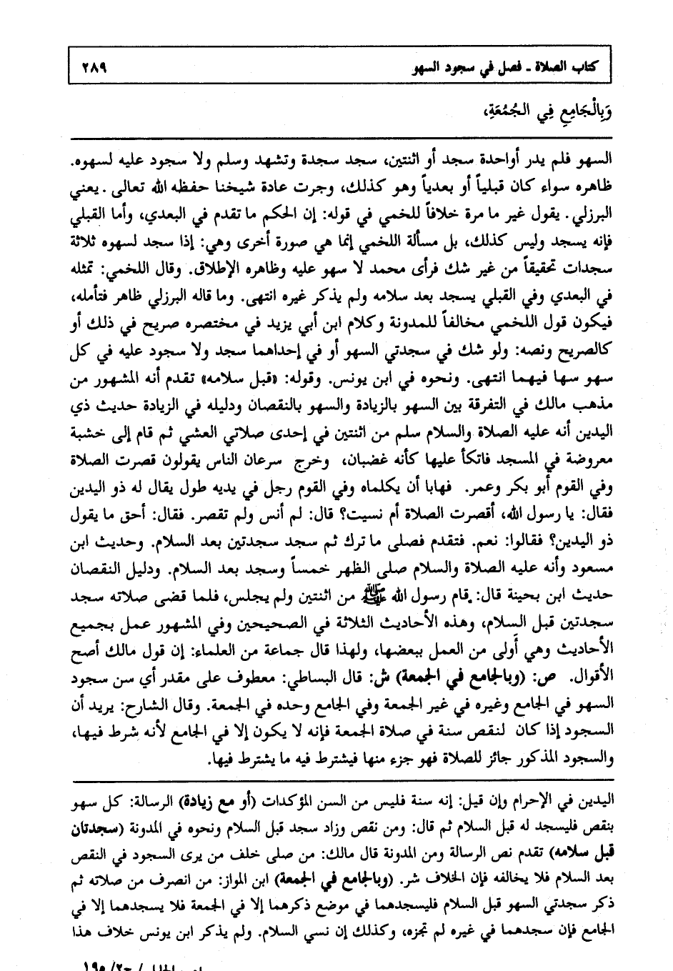 ص: "وبالجامع في الجمعة" ش: قال البساطي معطوف على مقدر أي سن سجود السهو في الجامع وغيره في غير الجمعة وفي الجامع وحده في الجمعة وقال الشارح: يريدان السجود إذا كان لنقص سنة في صلاة الجمعة فإنه لا يكون إلا في الجامع ; لأنه شرط فيها والسجود المذكور جائز للصلاة فهو جزء منها فيشترط فيه ما يشترط فيها.
