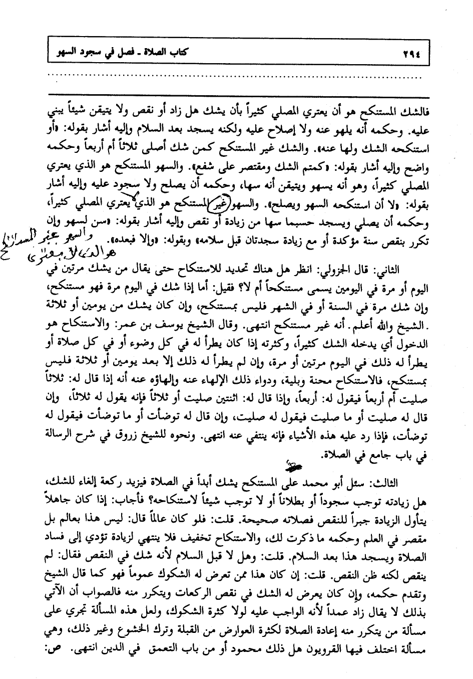 الثاني : قال الجزولي انظر هل هناك تحديد للاستنكاح حتى يقال من يشك مرتين في اليوم أو مرة في اليومين يسمى مستنكحا أم لا ؟ فقيل: أما إذا شك في اليوم مرة فهو مستنكح وإن شك مرة في السنة أو في الشهر فليس بمستنكح وإن كان يشك من يومين أو ثلاثة الشيخ والله أعلم أنه غير مستنكح, انتهى. وقال الشيخ يوسف بن عمر: والاستنكاح هو الدخول أي يدخله الشك كثيرا وكثرته إذا كان يطرأ له في كل وضوء أو في كل صلاة أو يطرأ له ذلك في اليوم مرتين أو مرة وإن لم يطرأ له ذلك إلا بعد يوم أو يومين أو ثلاثة فليس بمستنكح فالاستنكاح محنة وبلية ودواء ذلك الإلهاء عنه, وإلهاؤه عنه أنه إذا قال له: ثلاثا صليت أم أربعا ؟ فيقول له: أربعا, وإذا قال له: اثنتين صليت أو ثلاثا ؟ فإنه يقول له ثلاثا, وإن قال له: صليت أو ما صليت ؟ فيقول له صليت, وإن قال له: توضأت أو ما توضأت ؟ فيقول له: توضأت, فإذا رد عليه هذه الأشياء فإنه ينتفي عنه انتهى. ونحوه للشيخ زروق في شرح الرسالة في باب جامع في الصلاة.