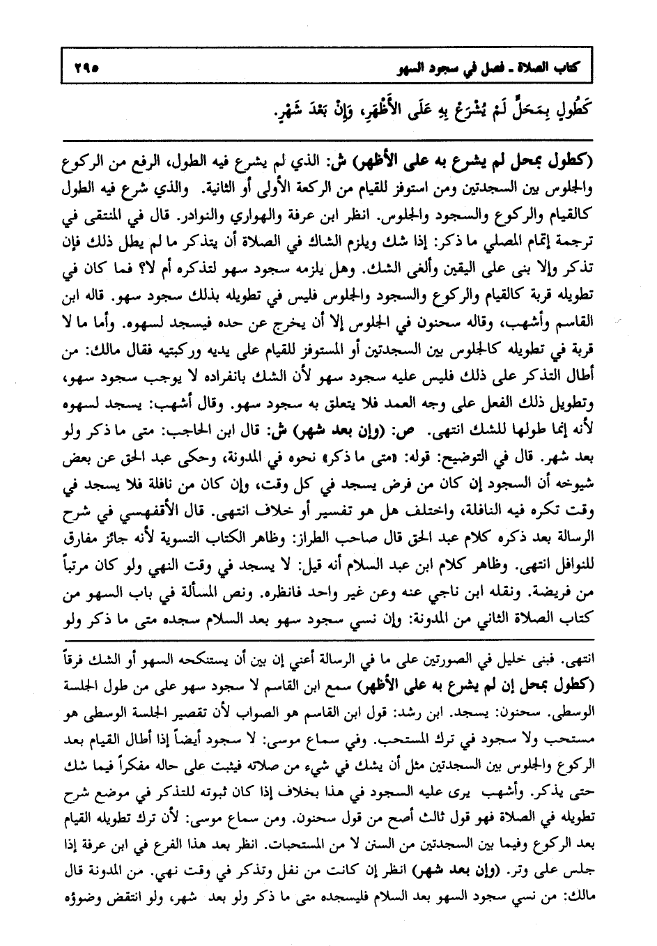 "كطول بمحل لم يشرع به على الأظهر" ش: الذي لم يشرع فيه الطول الرفع من الركوع والجلوس بين السجدتين ومن استوفز للقيام من الركعة الأولى أوالثانية والذي شرع فيه الطول كالقيام والركوع والسجود والجلوس انظر ابن عرفة والهواري والنوادر قال في المنتقى في ترجمة إتمام المصلي ما ذكر إذا شك ويلزم الشاك في الصلاة أن يتذكر ما لم يطل ذلك فإن تذكر وإلا بنى على اليقين وألغى الشك وهل يلزمه سجود سهو لتذكره أم لا ؟ فما كان في تطويله قربة كالقيام والركوع والسجود والجلوس فليس في تطويله بذلك سجود سهو قاله ابن القاسم وأشهب وقاله سحنون في الجلوس إلا أن يخرج عن حده فيسجد لسهوه, وأما ما لا قربة في تطويله كالجلوس بين السجدتين أو المستوفز للقيام على يديه وركبتيه فقال مالك من أطال التذكر على ذلك فليس عليه سجود سهو ; لأن الشك بانفراده لا يوجب سجود سهو وتطويل ذلك الفعل على وجه العمد فلا يتعلق به سجود سهو وقال أشهب يسجد لسهوه ; لأنه إنما طولها للشك انتهى.