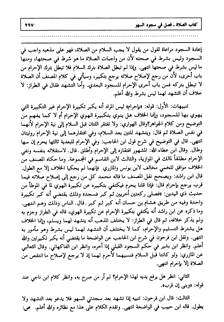 تنبيهات: الأول: قوله بإحرام ليس المراد أنه يكبر تكبيرة الإحرام غير التكبيرة التي يهوي بها للسجود, وإنما الخلاف هل ينوي بتكبيرة الهوي الإحرام أم لا ؟ كما يفهم من التوضيح ومن كلام الجواهر وقال الهواري: ولا تفتقر اللتان قبل السلام إلى نية الإحرام ; لأنهما في نفس الصلاة ثم قال: ويتشهد للتين بعد السلام وفي افتقارهما إلى نية الإحرام روايتان, انتهى. قال في التوضيح في شرح قول ابن الحاجب: وفي الإحرام للبعدية ثالثها يحرم إن سها وطال وقال ابن عطاء الله المشهور افتقاره إلى الإحرام وأطلق قال لاستقلاله بنفسه ونفي الإحرام مطلقا لمالك في الموازية, والثالث لابن القاسم في المجموعة وما حكاه المصنف من الخلاف موافق للخمي مخالف لابن يونس والمازري فإنهما لم يحكيا الخلاف إلا مع الطول قال ابن راشد ويصحح نقل المصنف ما قاله محمد كل من رجع إلى إصلاح صلاته فيما قرب يرجع بإحرام قال: فإذا قلنا يحرم فيكتفي بتكبيره عن تكبيرة الهوي لما في الموطأ من حديث ذي اليدين فصلى ركعتين أخريين ثم كبر فسجد وذلك يقتضي أنه كبر تكبيرة واحدة وفيه من طريق هشام بن حسان أنه كبر ثم كبر قال الناس وذلك وهم, انتهى. وما ذكره عن ابن راشد أنه يكتفي بتكبيرة الإحرام عن تكبيرة الهوي قاله في الطراز وجزم به ولم يذكر خلافه ثم قال في الطراز لا يختلف المذهب أنه يتشهد لهما ويسلم وإنما الخلاف هل يشترط التسليم والإحرام كما لا يختلف أن التشهد لهما ليس بشرط وهو مأمور به, انتهى. ونقل ابن فرحون في شرح ابن الحاجب عن الواضحة ما يقتضي أنه يكبر تكبيرتين والله أعلم وانظر ابن بشير في حكم السجود القبلي إذا أخره وانظر ابن الفاكهاني وقال الثعالبي عن المازري, ولو كانتا قبل السلام فنسيهما لأحرم لهما إذ لا يرجع لإصلاح ما انتقص من الصلاة إلا بإحرام, انتهى.
