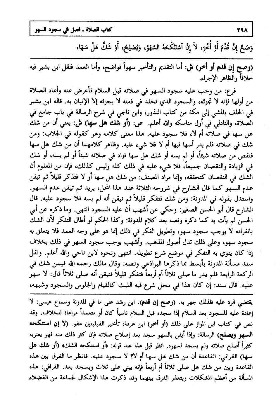 ص: "أو شك هل سها" ش: يعني أن من شك هل سها في صلاته أم لا ؟ فلا سجود عليه هذا معنى كلامه وهو كقوله في الجلاب ومن شك في صلاته فلم يدر سها فيها أم لا فلا شيء عليه, وظاهر كلامهما أن من شك هل سها فنقص من صلاته شيئا أو لم يسه أو شك هل سها فزاد في صلاته شيئا أو لم يسه أو شك في الزيادة والنقصان جميعا فلا شيء عليه في ذلك كله وليس كذلك فإن من المعلوم أن الشك في النقصان كتحققه, وإنما مراد المصنف من شك هل سها أو لا فتذكر قليلا ثم تيقن عدم السهو كما قال الشارح في شروحه الثلاثة عند هذا المحل يريد ثم تيقن عدم السهو واستدل بقوله في المدونة ومن شك فتفكر قليلا ثم تيقن أنه لم يسه فلا سجود عليه قال الشارح قال أبو الحسن الصغير وحكي عن أشهب أن عليه السجود انتهى. وما ذكره عن أبي الحسن لم يأت به كما ذكره ونصه بعد كلام المدونة وكذا الحكم لو أطال التفكر ; لأن الشك بانفراده لا يوجب سجود سهو وتطويل الفكر في ذلك إنما هو على وجه العمد فلا يتعلق به سجود سهو وعلى ذلك تدل أصول المذهب وأشهب يوجب سجود السهو في ذلك بخلاف إذا كان ينوي به التفكر في موضع شرع تطويله, انتهى. ونحوه لابن ناجي والله أعلم ونقل سند مسألة المدونة بأبسط مما ذكرها البراذعي ونصه وقال مالك رحمه الله فيمن شك في الركعة الرابعة فلم يدر ما صلى ثلاثا أم أربعا فتفكر قليلا فاستيقن أنه صلى ثلاثا قال: لا سهو عليه. قال سند: إن كان هذا في محل شرع فيه اللبث كالقيام والجلوس والسجود وشبهه
