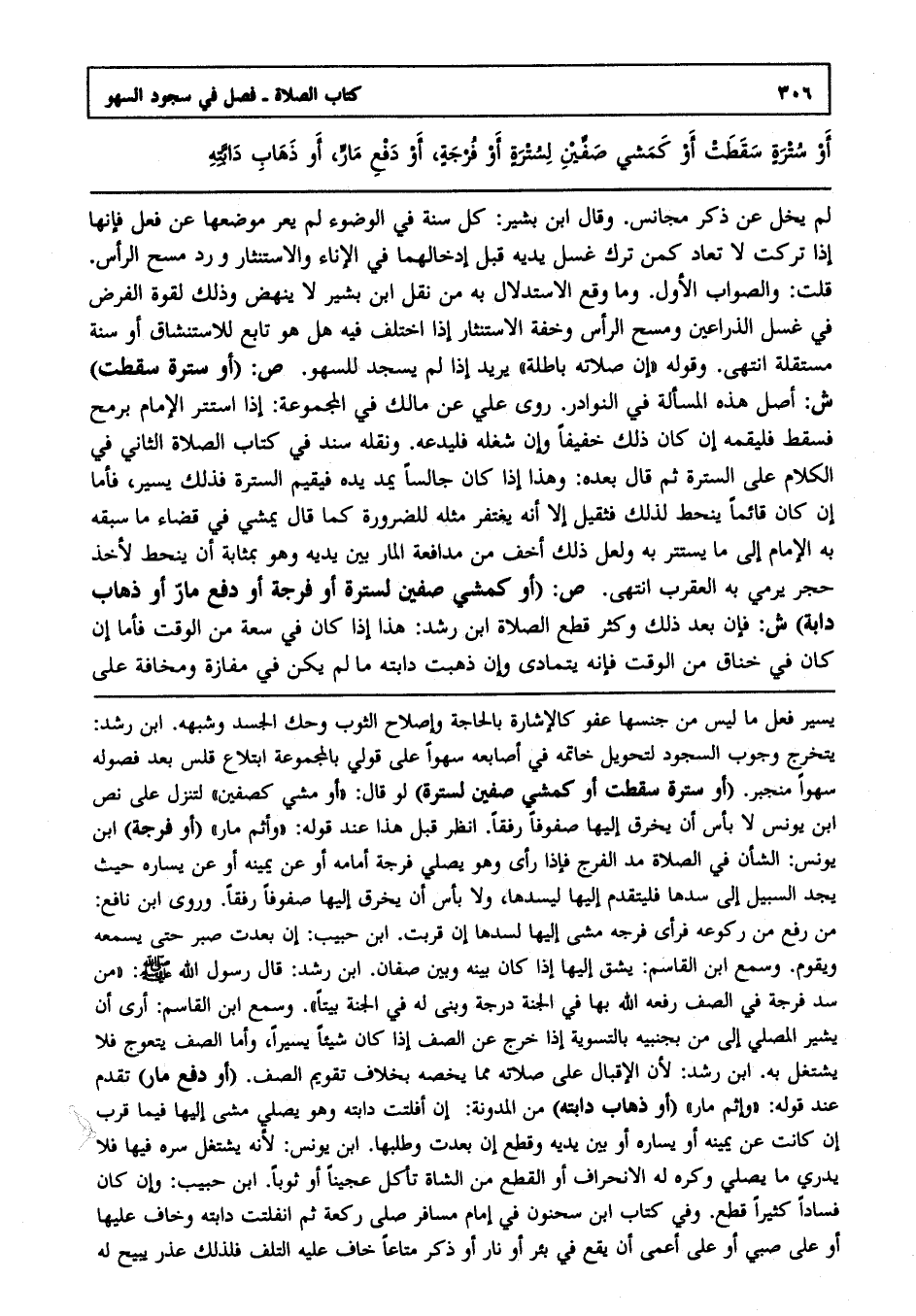 لم يخل عن ذكر مجانس وقال ابن بشير: كل سنة في الوضوء ولم يعر موضعها عن فعل فإنها إذا تركت لا تعاد كمن ترك غسل يديه قبل إدخالهما في الإناء والاستنثار ورد مسح الرأس. قلت: والصواب الأول وما وقع الاستدلال به من نقل ابن بشير لا ينهض وذلك لقوة الفرض في غسل الذراعين ومسح الرأس وخفة الاستنثار إذ اختلف فيه هل هو تابع للاستنشاق أو صفة مستقلة, انتهى. وقوله إن صلاته باطلة يريد إذا لم يسجد للسهو.