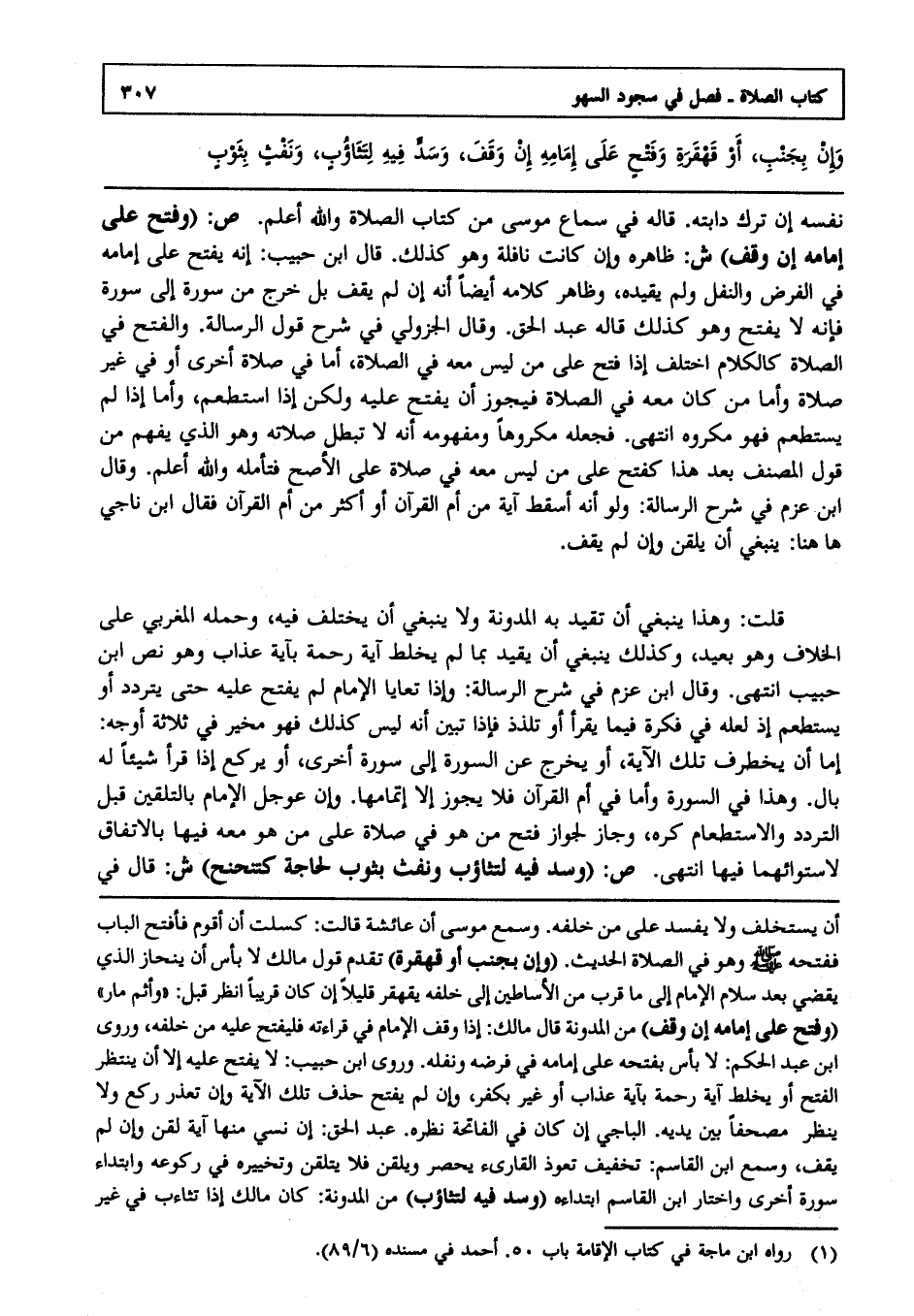 ص:"وفتح على إمامه إن وقف" ش: ظاهره وإن كانت نافلة وهو كذلك قال ابن حبيب: إنه يفتح على إمامه في الفرض والنفل ولم يقيده وظاهر كلامه أيضا أنه إن لم يقف بل خرج من سورة إلى سورة فإنه لا يفتح, وهو كذلك قاله عبد الحق, وقال الجزولي في شرح قول الرسالة: والنفخ في الصلاة كالكلام اختلف إذا فتح على من ليس معه في الصلاة إما في صلاة أخرى أو في غير صلاة, وأما من كان معه في الصلاة فيجوز أن يفتح عليه ولكن إذا استطعم وأما إذا لم يستطعم فهو مكروه, انتهى. فجعله مكروها ومفهومه أنه لا تبطل صلاته وهو الذي يفهم من قول المصنف بعد هذا كفتح على من ليس معه في صلاة على الأصح فتأمله والله أعلم, وقال ابن عزم في شرح الرسالة: ولو أنه أسقط آية من أم القرآن أو أكثر من أم القرآن فقال ابن ناجي: هاهنا ينبغي أن يلقن وإن لم يقف.