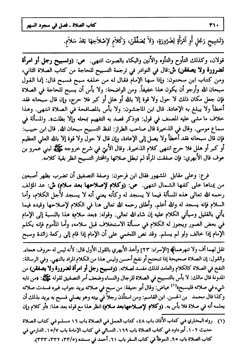 وتسبيح رجل أو امرأة لضرورة ولا يصفقن وكلام لإصلاحها بعد سلام