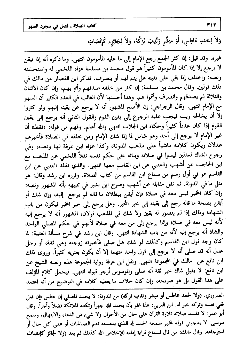 غيره وقد قيل إذا كثر الجمع رجع الإمام إلى ما عليه المأمومون, انتهى. وما ذكره أنه إذا تيقن لا يرجع إلا إذا كان المأمومون كثيرا هو قول محمد بن مسلمة عزاه اللخمي له واستحسنه ونصه واختلف إذا بقي على يقينه هل يتم لهم أو ينصرف ؟ فذكر ابن القصار عن مالك في ذلك قولين, وقال محمد بن مسلمة إن كثر من خلفه صدقهم وأتم بهم وإن كان الاثنان والثلاثة لم يصدقهم وانصرف وأتموا لهم وهذا أحسنها ; لأن الغالب في العدد الكثير أن السهو مع الإمام, انتهى. وقال الرجراجي: إن الأصح المشهور أنه لا يرجع عن يقينه إليهم ولو كثروا إلا أن يخالجه ريب فيجب عليه الرجوع إلى يقين القوم والقول الثاني أنه يرجع إلى يقين القوم إذا كانوا عددا كثيرا وحكاه ابن الجلاب, انتهى. والله أعلم. وفهم من قوله فقط أن غير الإمام لا يرجع إلى أحد وهو شامل لما إذا شك الإمام ومن خلفه في الصلاة فأخبرهم عدلان ويكون كلامه ماشيا على مذهب المدونة وكذا عزاه ابن عرفة لها ونصه وفي رجوع الشاك لعدلين ليسوا في صلاته وبنائه على حكم نفسه نقلا اللخمي عن المذهب مع ابن الحاجب عن أشهب والعتبي عن ابن القاسم معها, انتهى. والذي تقلد العتبي عن ابن القاسم هو في أول رسم من سماع ابن القاسم من كتاب الصلاة وقرره ابن راشد, وقال: هو مثل ما في المدونة ثم نقل مقابله عن أشهب وصرح ابن بشير في تنبيهه بأنه المشهور ونصه وإن كان المخبر ليس معه في صلاة فإن أيقن ببطلان ما قاله لم يرجع إليه وإن شك أو أيقن بصحة ما قاله رجع إلى يقينه لا إلى خبر المخبر وهل يرجع إلى خبر المخبر فيكون من باب الشهادة وذلك إذا لم يتصور له يقين ولا شك في المذهب قولان المشهور أنه لا يرجع إليه ; لأنه ليس معه في صلاة وإنما يرجع إلى من معه في صلاة ; لأنهم في حكم المصلي الواحد والشاذ أنه يرجع إليه ; لأنه من باب الشهادة, انتهى. وقال ابن رشد في شرح مسألة العتبية لما أن وجه قول ابن القاسم وكذلك لو شك هل صلى فأخبرته زوجته وهي ثقة أو رجل عدل أنه قد صلى أنه لا يرجع إلى قول واحد منهما إلا أن يكون يعتريه كثيرا وروى ذلك ابن نافع عن مالك في المجموعة انتهى. ونقل ابن عرفة رواية المجموعة هذه ونصه الشيخ عن ابن نافع لا يقبل شاك خبر ثقة أنه صلى والموسوس أرجو قبوله, انتهى. فيحمل كلام المؤلف على هذا القول بل هو صريحه وإن كان خلاف ما يعطيه كلامه في التوضيح من أنه اعتمد