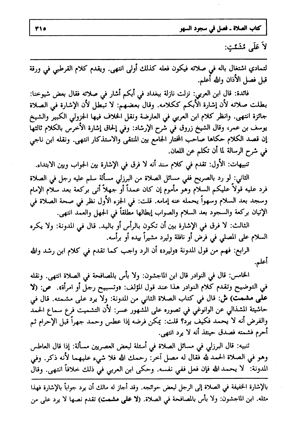 فائدة : قال ابن العربي: نزلت نازلة ببغداد في أبكم أشار في صلاته فقال بعض شيوخنا: بطلت صلاته ; لأن إشارة الأبكم ككلامه, وقال بعضهم: لا تبطل ; لأن الإشارة في الصلاة جائزة, انتهى. وانظر كلام ابن العربي في العارضة ونقل الخلاف فيها الجزولي الكبير والشيخ يوسف بن عمر وقال الشيخ زروق في شرح الإرشاد وفي إلحاق إشارة الأخرس بالكلام. ثالثها إن قصد الكلام حكاها صاحب المختار الجامع بين المنتقى والاستذكار, انتهى. ونقله ابن ناجي في شرح الرسالة لما أن تكلم على اللعان.