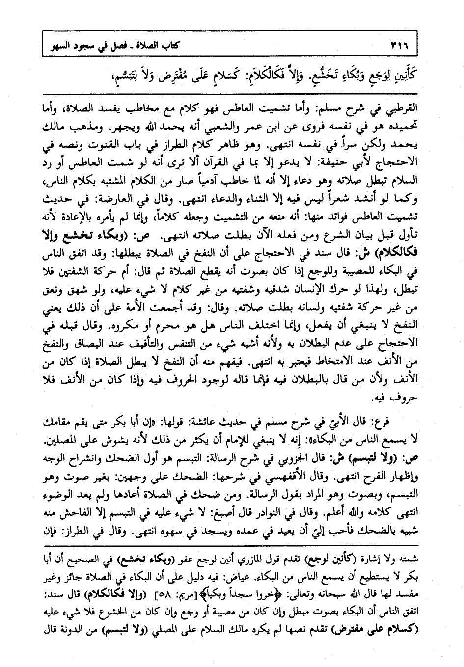 ص: "وبكاء تخشع وإلا فكالكلام" ش: قال سند في الاحتجاج على أن النفخ في الصلاة يبطلها: وقد اتفق الناس في البكاء للمصيبة وللوجع إذا كان بصوت أنه يقطع الصلاة, ثم قال: أما حركة الشفتين فلا تبطل ولهذا لو حرك الإنسان شدقيه وشفتيه من غير كلام لا شيء عليه, ولو شهق ونعق من غير حركة شفتيه ولسانه بطلت صلاته, وقال: وقد أجمعت الأمة على أن ذلك يعني النفخ لا ينبغي أن يفعل وإنما اختلف الناس هل هو محرم أو مكروه, وقال قبله في الاحتجاج على عدم البطلان به ولأنه أشبه شيء من التنفس والتأفيف عند البصاق والنفخ من الأنف عند الامتخاط فيعتبر به انتهى. فيفهم منه أن النفخ لا يبطل الصلاة إذا كان من الأنف ولأن من قال بالبطلان فيه فإنما قاله لوجود الحروف فيه وإذا كان من الأنف فلا حروف فيه.