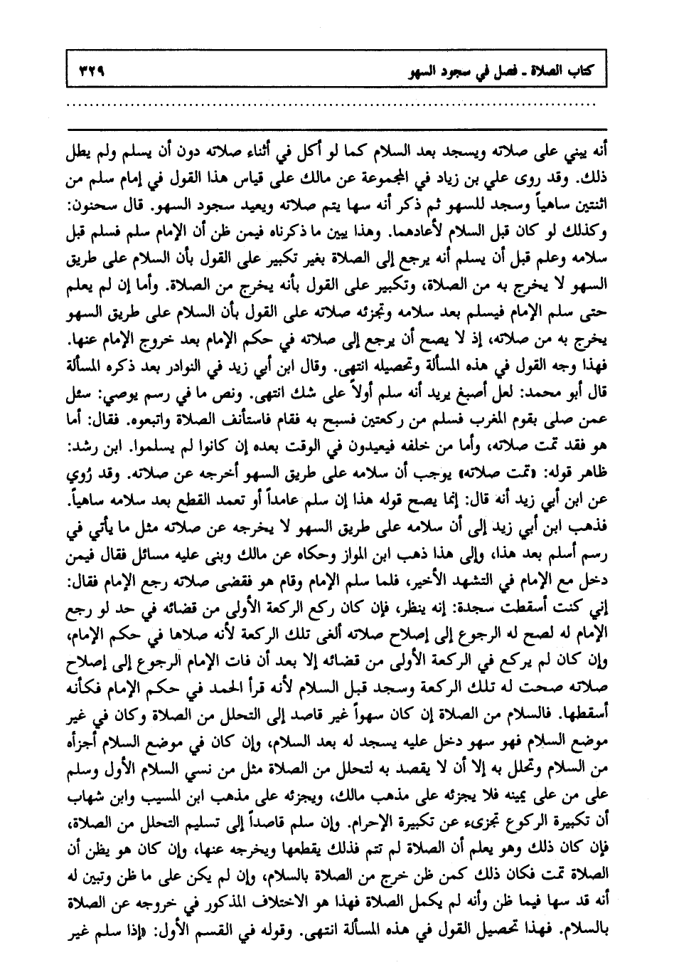 أنه يبني على صلاته ويسجد بعد السلام كما لو أكل في أثناء صلاته دون أن يسلم ولم يطل ذلك, وقد روى علي بن زياد في المجموعة عن مالك على قياس هذا القول في إمام سلم من اثنتين ساهيا وسجد للسهو ثم ذكر أنه سها يتم صلاته ويعيد سجود السهو, وقال سحنون: وكذلك لو كان قبل السلام لأعادهما, وهذا يبين ما ذكرنا فيمن ظن أن الإمام سلم فسلم قبل سلامه فعلم قبل أن يسلم أنه يرجع إلى الصلاة بغير تكبير على القول بأن السلام على طريق السهو لا يخرج به من الصلاة وتكبير على القول بأنه يخرج به من الصلاة, وأما إن لم يعلم حتى سلم الإمام فيسلم بعد سلامه وتجزئه صلاته على القول بأن السلام على طريق السهو يخرج به من صلاته إذ لا يصح أن يرجع إلى صلاته في حكم الإمام بعد خروج الإمام عنها فهذا وجه القول في هذه المسألة وتحصيله انتهى. وقال ابن أبي زيد في النوادر بعد ذكره المسألة قال أبو محمد لعل أصبغ يريد أنه سلم أولا على شك, انتهى. ونص ما في رسم يوصي. سئل عمن صلى بقوم المغرب فسلم من ركعتين فسبح به فقام فاستأنف الصلاة واتبعوه, فقال: أما هو فقد تمت صلاته وأما من خلفه فيعيدون في الوقت وبعده إن كانوا لم يسلموا ابن رشد. ظاهر قوله تمت صلاته يوجب أن سلامه على طريق السهو أخرجه عن صلاته وقد روي عن ابن أبي زيد أنه قال إنما يصح قوله هذا إن سلم عامدا أو تعمد القطع بعد سلامه ساهيا فذهب ابن أبي زيد إلى أن سلامه على طريق السهو لا يخرجه عن صلاته مثل ما يأتي في رسم أسلم بعد هذا وإلى هذا ذهب ابن المواز وحكاه عن مالك وبنى عليه مسائل فقال فيمن دخل مع الإمام في التشهد الأخير فلما سلم الإمام وقام هو فقضى صلاته رجع الإمام فقال: إني كنت أسقطت سجدة إنه ينظر فإن كان ركع الركعة الأولى من قضائه في حد لو رجع الإمام له لصح له الرجوع إلى إصلاح صلاته ألغى تلك الركعة ; لأنه صلاها في حكم الإمام وإن كان لم يركع في الركعة الأولى من قضائه إلا بعد أن فات الإمام الرجوع إلى إصلاح صلاته صحت له تلك الركعة وسجد قبل السلام ; لأنه قرأ الحمد في حكم الإمام فكأنه أسقطها فالسلام من الصلاة إن كان سهوا غير قاصد إلى التحلل من الصلاة وكان في غير موضع السلام فهو سهو دخل عليه يسجد له بعد السلام وإن كان في موضع السلام أجزأه من السلام وتحلل به إلا أن لا يقصد به التحلل من الصلاة مثل من نسي السلام الأول وسلم على من على يمينه فلا يجزئه على مذهب مالك ويجزئه على مذهب ابن المسيب وابن شهاب من أن تكبيرة الركوع تجزئ عن تكبيرة الإحرام, وإن سلم قاصدا إلى تسليم التحلل من الصلاة فإن كان ذلك وهو يعلم أن الصلاة لم تتم فذلك يقطعها ويخرجه عنها, وإن كان وهو يظن أن الصلاة تمت فكان ذلك كمن ظن خرج من الصلاة بالسلام, وإن لم يكن على ما ظن وتبين له أنه قد سها فيما ظن وأنه لم يكمل الصلاة فهذا هو الاختلاف المذكور في خروجه عن الصلاة بالسلام فهذا تحصيل القول في هذه المسألة انتهى. وقوله في القسم الأول إذا سلم غير