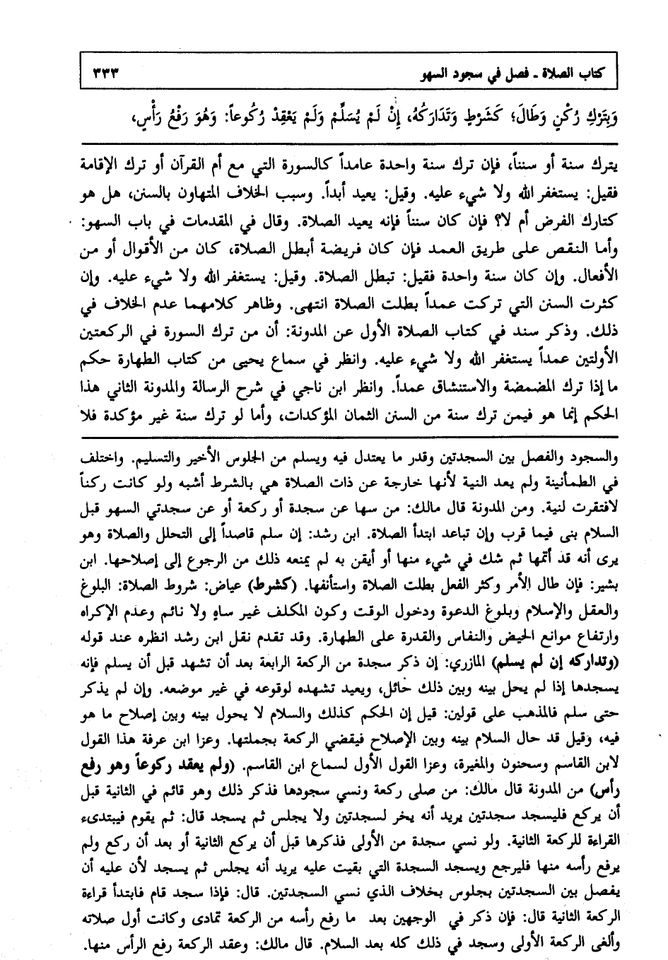 يترك سنة أو سننا فإن ترك سنة واحدة عامدا كالسورة التي مع أم القرآن أو ترك الإقامة فقيل يستغفر الله ولا شيء عليه وقيل يعيد أبدا, وسبب الخلاف المتهاون بالسنن هل هو كتارك الفرض أم لا ؟ فإن كان سننا فإنه يعيد الصلاة, وقال في المقدمات في باب السهو: وأما النقص على طريق العمد فإن كان فريضة أبطل الصلاة كان من الأقوال أو من الأفعال, وإن كان سنة واحدة فقيل: تبطل الصلاة, وقيل: يستغفر الله ولا شيء عليه وإن كثرت السنن التي تركت عمدا بطلت الصلاة, انتهى. وظاهر كلامهما عدم الخلاف في ذلك وذكر سند في كتاب الصلاة الأول عن المدونة: أن من ترك السورة في الركعتين الأولتين عمدا يستغفر الله ولا شيء عليه, وانظر في سماع يحيى من كتاب الطهارة حكم ما إذا ترك المضمضة والاستنشاق عمدا, وانظر ابن ناجي في شرح الرسالة والمدونة الثاني هذا الحكم إنما هو فيمن ترك سنة من السنن الثمان المؤكدات, وأما لو ترك سنة غير مؤكدة فلا