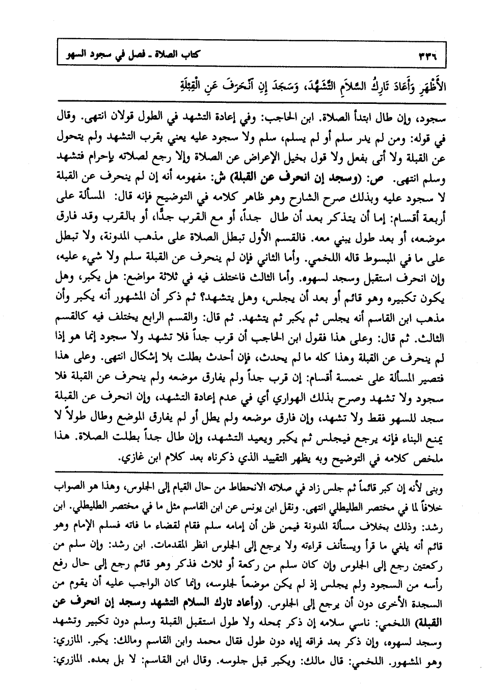 سجود وإن طال ابتدأ الصلاة ابن الحاجب وفي إعادة التشهد في الطول قولان, انتهى. وقال في قوله: ومن لم يدر سلم أو لم يسلم: سلم ولا سجود عليه يعني بقرب التشهد ولم يتحول عن القبلة ولا أتى بفعل ولا قول يخيل الإعراض عن الصلاة وإلا رجع لصلاته بإحرام فتشهد وسلم, انتهى.