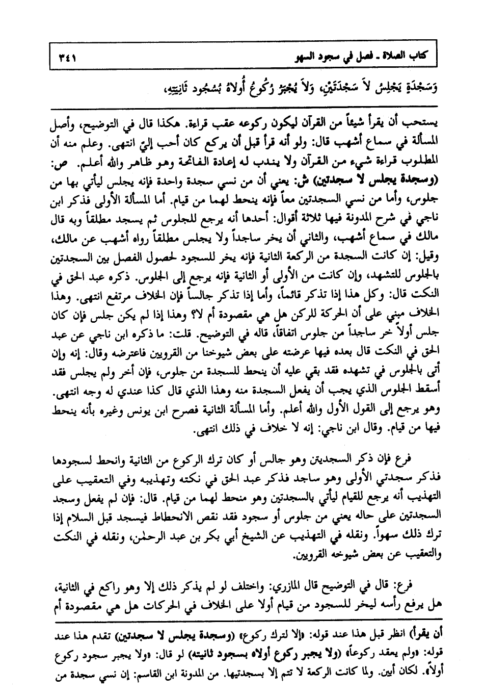ص: "وسجدة يجلس لا سجدتين" ش: يعني أن من نسي سجدة واحدة فإنه يجلس ليأتي بها من جلوس, وأما من نسي السجدتين معا فإنه ينحط لهما من قيام. أما المسألة الأولى فذكر ابن ناجي في شرح المدونة فيها ثلاثة أقوال: أحدها أنه يرجع للجلوس ثم يسجد مطلقا وبه قال مالك في سماع أشهب والثاني أنه يخر ساجدا ولا يجلس مطلقا رواه أشهب عن مالك, وقيل: إن كانت السجدة من الركعة الثانية فإنه يخر للسجود لحصول الفصل بين السجدتين بالجلوس للتشهد وإن كانت من الأولى أو الثانية فإنه يرجع إلى الجلوس ذكره عبد الحق في النكت. قال: وكل هذا إذا تذكر قائما وأما إن تذكر جالسا فإن الخلاف مرتفع, انتهى. وهذا الخلاف مبني على أن الحركة للركن هل هي مقصودة أم لا ؟ وهذا إذا لم يكن جلس فإن كان جلس أولا خر ساجدا من جلوس اتفاقا قاله في التوضيح. قلت: ما ذكره ابن ناجي عن عبد الحق في النكت قال بعده فيها: عرضته على بعض شيوخنا من القرويين فاعترضه, وقال: إنه وإن أتى بالجلوس في تشهده فقد بقي عليه أن ينحط للسجدة من جلوس فإن أخر ولم يجلس فقد أسقط الجلوس الذي يجب أن يفعل السجدة منه, وهذا الذي قال كذا عندي له وجه, انتهى. وهو يرجع إلى القول الأول والله أعلم وأما المسألة الثانية فصرح ابن يونس وغيره بأنه ينحط فيها من قيام, وقال ابن ناجي: إنه لا خلاف في ذلك, انتهى.