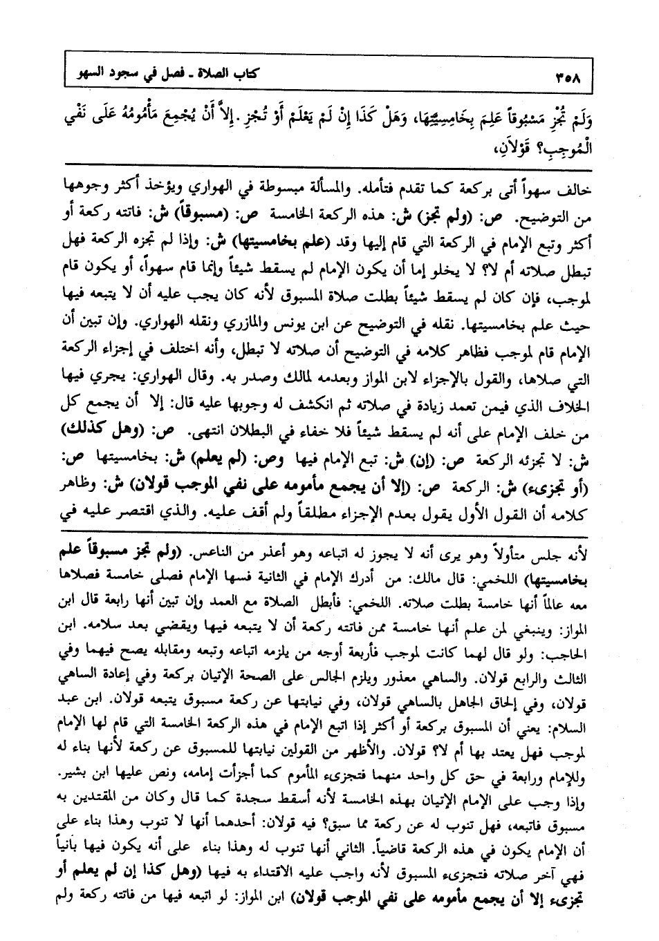 خالف سهوا أتى بركعة كما تقدم فتأمله والمسألة مبسوطة في الهواري ويؤخذ أكثر وجوهها من التوضيح ص: "ولم تجز" ش هذه الركعة الخامسة ص:"مسبوقا" ش: فاتته ركعة أو أكثر, وتبع الإمام في الركعة التي قام إليها, وقد "علم بخامسيتها" ش, وإذا لم تجزه الركعة, فهل تبطل صلاته أم لا ؟ لا يخلو إما أن يكون الإمام لم يسقط شيئا, وإنما قام سهوا, أو يكون قام لموجب, فإن كان لم يسقط شيئا بطلت صلاة المسبوق ; لأنه كان يجب عليه أن لا يتبعه فيها حيث علم بخامسيتها نقله في التوضيح عن ابن يونس والمازري ونقله الهواري, وإن تبين أن الإمام قام لموجب فظاهر كلامه في التوضيح: أن صلاته لا تبطل, وأنه اختلف في إجزاء الركعة التي صلاها, والقول بالإجزاء لابن المواز وبعدمه لمالك وصدر به, وقال الهواري: يجري فيها الخلاف الذي فيمن تعمد زيادة في صلاته ثم انكشف له وجوبها عليه قال: إلا أن يجمع كل من خلف الإمام على أنه لم يسقط شيئا فلا خفاء في البطلان انتهى. ص:"وهل كذلك" ش: لا تجزئه الركعة ص:"إن" ش: تبع الإمام فيها وص:"لم يعلم" ش: بخامسيتها ص:"أو تجزئ" ش: الركعة ص:"إلا أن يجمع مأمومه على نفي الموجب قولان" ش:, وظاهر كلامه: أن القول الأول يقول بعدم الإجزاء مطلقا, ولم أقف عليه, والذي اقتصر عليه في