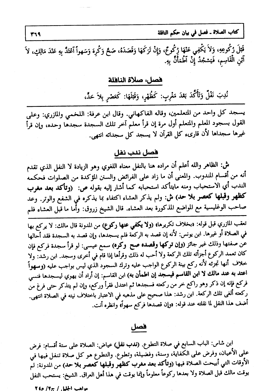 ش: الظاهر - والله أعلم - أن مراده هنا بالنفل معناه اللغوي, وهو الزيادة لا النفل الذي تقدم أنه من أقسام المندوب, والمعنى أن ما زاد على الفرائض والسنن المؤكدة من الصلوات فحكمه الندب أي الاستحباب, ومنه ما يتأكد استحبابه كما أشار إليه بقوله ص:"وتأكد بعد مغرب كظهر وقبلها كعصر بلا حد" ش: ولم يذكر العشاء اكتفاء بما يذكره في الشفع والوتر وعد صاحب الوغليسية مع المواضع المذكورة بعد العشاء الشيخ زروق, وأما ما قبل العشاء فلم