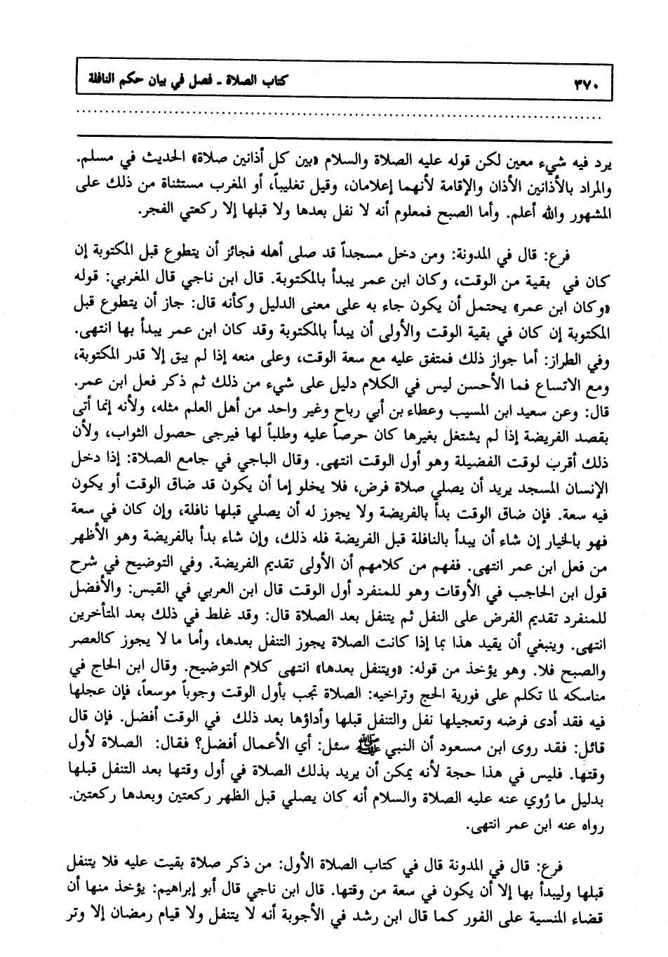 يرد فيه شيء معين لكن قوله عليه الصلاة والسلام بين كل أذانين صلاة الحديث في مسلم والمراد بالأذانين: الأذان والإقامة ; لأنهما إعلامان, وقيل: تغليبا أو المغرب مستثناة من ذلك على المشهور والله أعلم. وأما الصبح فمعلوم أنه لا نفل بعدها, ولا قبلها إلا ركعتي الفجر. فرع: قال في المدونة ومن دخل مسجدا قد صلى أهله فجائز أن يتطوع قبل المكتوبة إن كان في بقية من الوقت, وكان ابن عمر يبدأ بالمكتوبة قال ابن ناجي قال المغربي قوله: وكان ابن عمر يحتمل أن يكون جاء به على معنى الدليل, وكأنه قال: جاز أن يتطوع قبل المكتوبة إن كان في بقية من الوقت والأولى أن يبدأ بالمكتوبة, وقد كان ابن عمر يبدأ بها انتهى. وفي الطراز أما جواز ذلك فمتفق عليه مع سعة الوقت, وعلى منعه إذا لم يبق إلا قدر المكتوبة, ومع الاتساع فما الأحسن ؟ ليس في الكلام دليل على شيء من ذلك ثم ذكر فعل ابن عمر قال: وعن سعيد بن المسيب وعطاء بن أبي رباح وغير واحد من أهل العلم مثله, ولأنه إنما أتي بقصد الفريضة فإذا لم يشتغل بغيرها كان حرصا عليها وطلبا لها فيرجى حصول الثواب ولأن ذلك أقرب لوقت الفضيلة, وهو أول الوقت انتهى. وقال الباجي في جامع الصلاة: إذا دخل الإنسان المسجد يريد أن يصلي صلاة فرض فلا يخلو: إما أن يكون قد ضاق الوقت, أو يكون فيه سعة فإن ضاق الوقت بدأ بالفريضة, ولا يجوز له أن يصلي قبلها نافلة, وإن كان في سعة فهو بالخيار إن شاء أن يبدأ بالنافلة قبل الفريضة فله ذلك, وإن شاء بدأ بالفريضة, وهو الأظهر من فعل ابن عمر انتهى. ففهم من كلامهم أن الأولى تقديم الفريضة, وفي التوضيح في شرح قول ابن الحاجب في الأوقات, وهو للمنفرد أول الوقت قال ابن العربي في القبس: والأفضل للمنفرد تقديم الفرض على النفل ثم يتنفل بعد الصلاة قال, وقد غلط في ذلك بعض المتأخرين انتهى. وينبغي أن يقيد هذا بما إذا كانت الصلاة يجوز التنفل بعدها, وأما ما لا يجوز كالعصر والصبح فلا, وهو يؤخذ من قوله: ويتنفل بعدها انتهى. كلام التوضيح, وقال ابن الحاج في مناسكه لما تكلم على فورية الحج وتراخيه: الصلاة تجب بأول الوقت وجوبا موسعا فإن عجلها فيه فقد أدى فرضه وتعجيلها نفل, والتنفل قبلها, وأداؤها بعد ذلك في الوقت أفضل, فإن قال قائل: فقد روى ابن مسعود أن النبي صلى الله عليه وسلم سئل أي الأعمال أفضل ؟ فقال: الصلاة لأول وقتها فليس في هذا حجة ; لأنه يمكن أن يريد بذلك الصلاة في أول وقتها بعد التنفل قبلها بدليل ما روي عنه عليه الصلاة والسلام أنه كان يصلي قبل الظهر ركعتين وبعدها ركعتين رواه عنه ابن عمر انتهى.