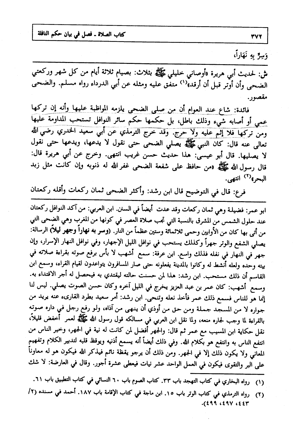 فائدة: شاع عند العوام أن من صلى الضحى يلزمه المواظبة عليها, وأنه إن تركها عمي أو أصابه شيء, وذلك باطل بل حكمها حكم سائر النوافل تستحب المداومة عليها, ومن تركها فلا إثم عليه, ولا حرج, وقد خرج الترمذي عن أبي سعيد الخدري رضي الله تعالى عنه قال كان النبي صلى الله عليه وسلم يصلي الضحى حتى نقول: لا يدعها ويدعها حتى نقول: لا يصليها قال أبو عيسى هذا حديث حسن غريب انتهى. وخرج عن أبي هريرة قال: قال رسول الله صلى الله عليه وسلم: من حافظ على شفعة الضحى غفر الله له ذنوبه, وإن كانت مثل زبد البحر(2) انتهى.