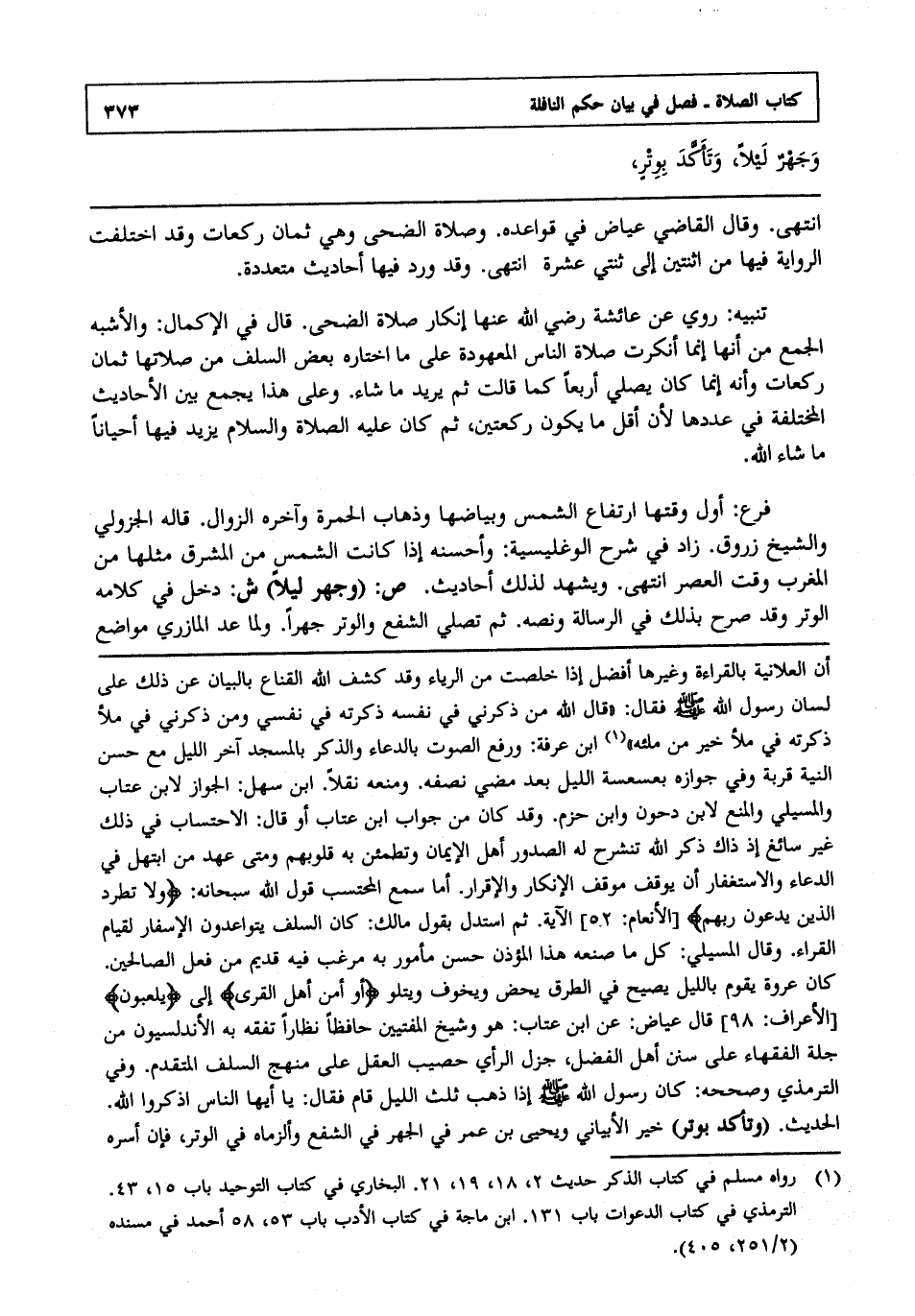 فرع : أول وقتها ارتفاع الشمس وبياضها وذهاب الحمرة وآخره الزوال قاله الجزولي والشيخ زروق زاد في شرح الوغليسية وأحسنه إذا كانت الشمس من المشرق مثلها من المغرب وقت العصر انتهى. ويشهد لذلك أحاديث ص: "وجهر ليلا" ش: دخل في كلامه الوتر, وقد صرح بذلك في الرسالة ونصه: ثم تصلي الشفع والوتر جهرا ولما عد المازري مواضع