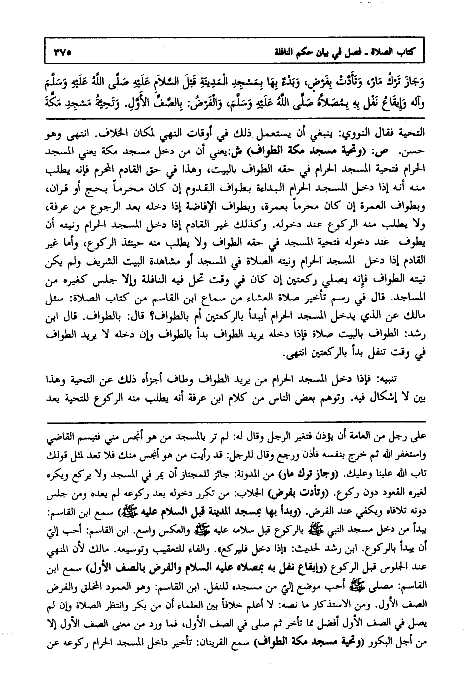 التحية فقال النووي ينبغي أن يستعمل ذلك في أوقات النهي لمكان الخلاف انتهى. وهو حسنص "وتحية مسجد مكة الطواف" ش: يعني أن من دخل مسجد مكة يعني المسجد الحرام فتحية المسجد الحرام في حقه الطواف بالبيت, وهذا في حق القادم المحرم فإنه يطلب منه أنه إذا دخل المسجد الحرام البداءة بطواف القدوم إن كان محرما بحج أو قران وبطواف العمرة إن كان محرما بعمرة وبطواف الإفاضة إذا دخله بعد الرجوع من عرفة, ولا يطلب منه الركوع عند دخوله وكذلك غير القادم إذا دخل المسجد الحرام ونيته أن يطوف عند دخوله فتحية المسجد في حقه الطواف, ولا يطلب منه حينئذ الركوع, وأما غير القادم إذا دخل المسجد الحرام ونيته الصلاة في المسجد أو مشاهدة البيت الشريف, ولم يكن نيته الطواف فإنه يصلي ركعتين إن كان في وقت تحل فيه النافلة, وإلا جلس كغيره من المساجد قال في رسم تأخير صلاة العشاء من سماع ابن القاسم من كتاب الصلاة سئل مالك عن الذي يدخل المسجد الحرام أيبدأ بالركعتين أم بالطواف ؟ قال: بالطواف قال ابن رشد: الطواف بالبيت صلاة, فإذا دخله يريد الطواف بدأ بالطواف, وإن دخله لا يريد الطواف في وقت تنفل بدأ بالركعتين انتهى.