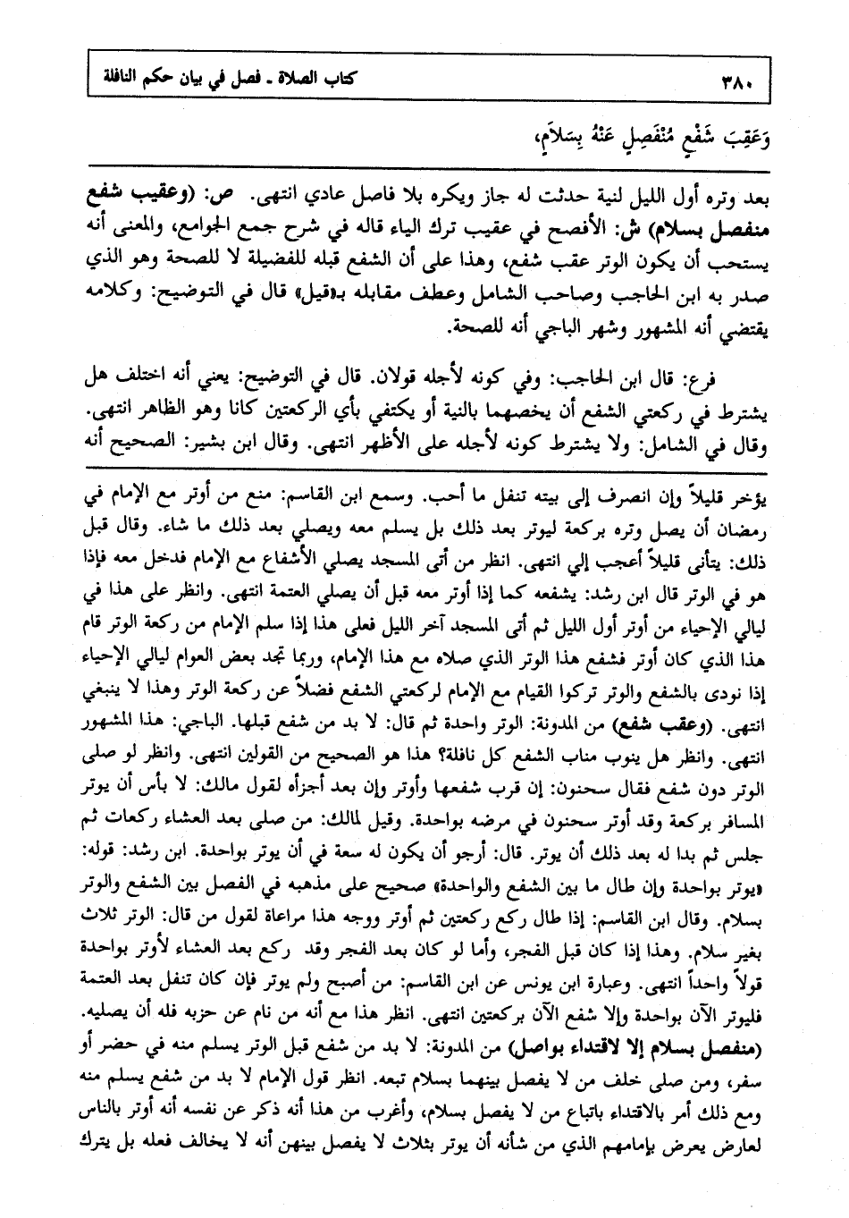 بعد وتره أول الليل لنية حدثت له جاز ويكره بلا فاصل عاد انتهى. ص: "وعقيب شفع منفصل بسلام" ش: الأفصح في عقيب ترك الياء قاله في شرح جمع الجوامع والمعنى أنه يستحب أن يكون الوتر عقب شفع, وهذا على أن الشفع قبله للفضيلة لا للصحة, وهو الذي صدر به ابن الحاجب وصاحب الشامل وعطف مقابله بقيل قال في التوضيح وكلامه يقتضي أنه المشهور وشهر الباجي أنه للصحة.