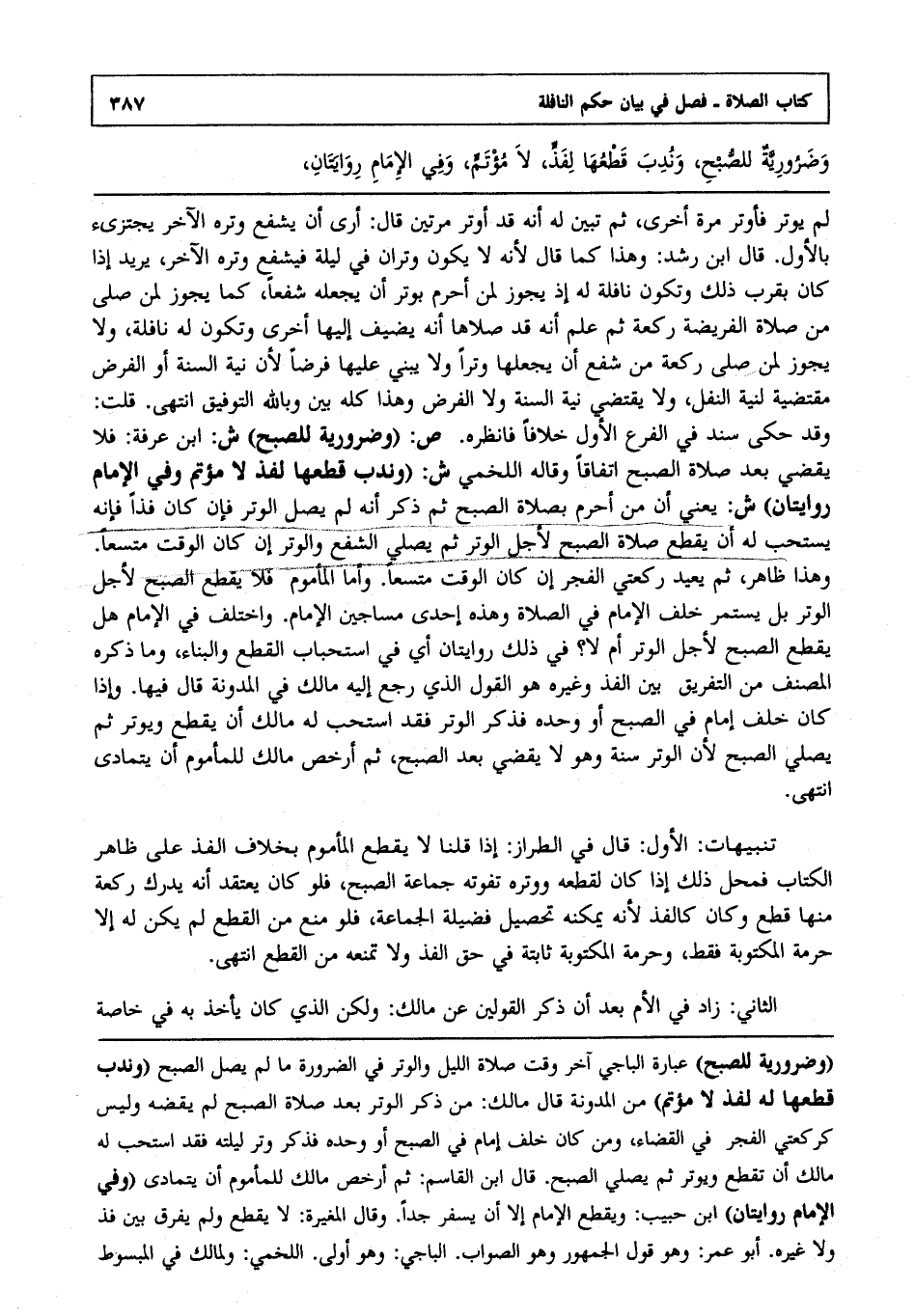 وضرورية للصبح وندب قطعها لفذ لا مؤتم وفي الإمام روايتان