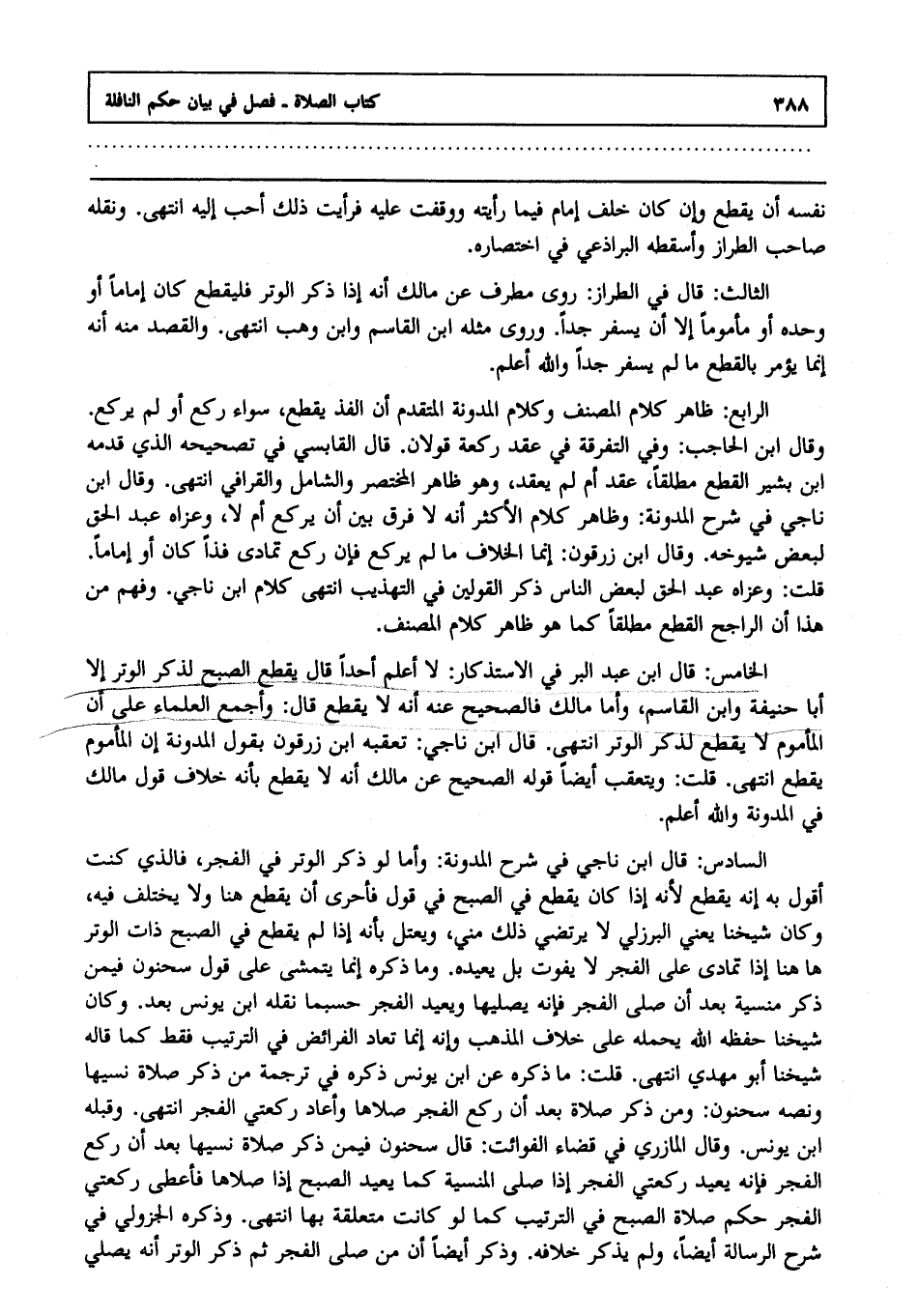 الثالث : قال في الطراز روى مطرف عن مالك أنه إذا ذكر الوتر فليقطع كان إماما أو وحده أو مأموما إلا أن يسفر جدا وروى مثله ابن القاسم وابن وهب انتهى. والقصد منه أنه إنما يؤمر بالقطع ما لم يسفر جدا, والله أعلم..