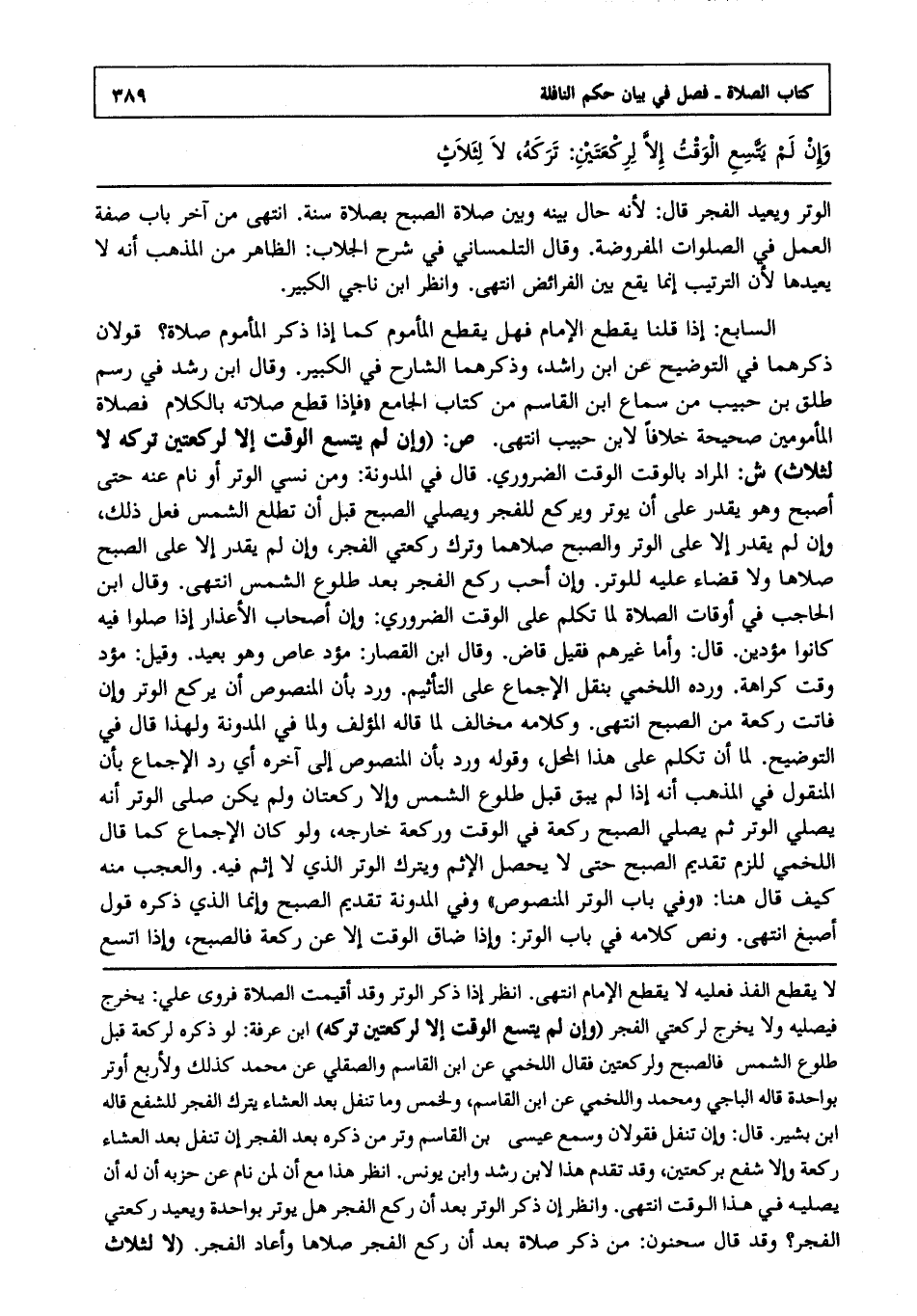 السابع: إذا قلنا يقطع الإمام, فهل يقطع المأموم كما إذا ذكر المأموم صلاة قولان ذكرهما في التوضيح عن ابن راشد وذكرهما الشارح في الكبير, وقال ابن رشد في رسم طلق بن حبيب من سماع ابن القاسم من كتاب الجامع فإذا قطع صلاته بالكلام فصلاة المأمومين صحيحة خلافا لابن حبيب انتهى. ص: "وإن لم يتسع الوقت إلا لركعتين تركه لا لثلاث" ش: المراد بالوقت: الوقت الضروري قال في المدونة ومن نسي الوتر أو نام عنه حتى أصبح, وهو يقدر على أن يوتر ويركع للفجر, ويصلي الصبح قبل أن تطلع الشمس فعل ذلك, وإن لم يقدر إلا على الوتر والصبح صلاهما, وترك ركعتي الفجر, وإن لم يقدر إلا على الصبح صلاها, ولا قضاء عليه للوتر, وإن أحب ركع الفجر بعد طلوع الشمس انتهى. وقال ابن الحاجب في أوقات الصلاة لما تكلم على الوقت الضروري وإن أصحاب الأعذار إذا صلوا فيه كانوا مؤدين قال: وأما غيرهم فقيل: قاض, وقال ابن القصار: مؤد عاص, وهو بعيد, وقيل: مؤد وقت كراهة ورده اللخمي بنقل الإجماع على التأثيم ورد بأن المنصوص أن يركع الوتر, وإن فاتت ركعة من الصبح انتهى. وكلامه مخالف لما قاله المؤلف ولما في المدونة ولهذا قال في التوضيح لما أن تكلم على هذا المحل: وقوله: ورد بأن المنصوص إلى آخره أي رد الإجماع بأن المنقول في المذهب أنه إذا لم يبق قبل طلوع الشمس إلا ركعتان, ولم يكن صلى الوتر أنه يصلي الوتر ثم يصلي الصبح ركعة في الوقت وركعة خارجه, ولو كان الإجماع كما قال اللخمي للزم تقديم الصبح حتى لا يحصل الإثم, ويترك الوتر الذي لا إثم فيه, والعجب منه كيف قال هنا: وفي باب الوتر المنصوص, وفي المدونة: تقديم الصبح وإنما الذي ذكره قول أصبغ انتهى. ونص كلامه في باب الوتر, وإذا ضاق الوقت إلا عن ركعة فالصبح, وإذا اتسع