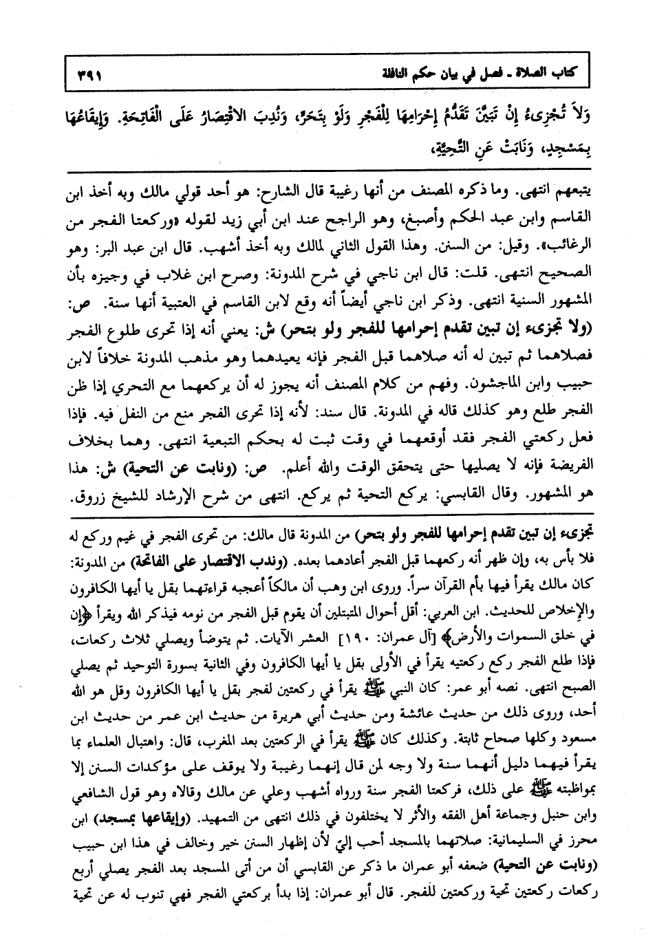 ولا تجزئ إن تبين تقدم إحرامها للفجر ولو بتحر وندب الاقتصار على الفاتحة وإيقاعها بمسجد ونابت عن التحية