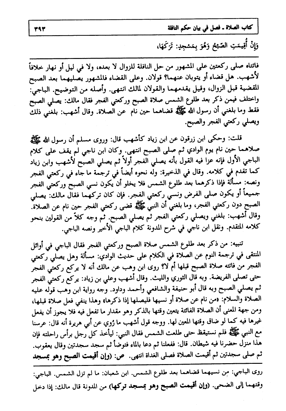 قلت: وحكى ابن زرقون عن ابن زياد كأشهب قال: وروى مسلم أن رسول الله صلى الله عليه وسلم صلاهما حين نام يوم الوادي ثم صلى الصبح انتهى. وكان ابن ناجي لم يقف على كلام الباجي الأول فإنه عزا فيه القول بأنه يصلي الفجر أولا ثم يصلي الصبح لأشهب وابن زياد كما تقدم في كلامه, وقال في الذخيرة وله نحوه أيضا في ترجمة ما جاء في ركعتي الفجر ونصه مسألة فإذا ذكرهما بعد طلوع الشمس, فلا يخلو أن يكون نسي الصبح وركعتي الفجر جميعا أو يكون صلى الفرض ونسي ركعتي الفجر فإن كان تركهما فقال مالك: يصلي الصبح دون ركعتي الفجر, وما بلغني أن النبي صلى الله عليه وسلم قضى ركعتي الفجر حين نام عن الصلاة, وقال أشهب بلغني ويصلي ركعتي الفجر ثم يصلي الصبح ثم وجه كلا من القولين بنحو كلامه المتقدم, ونقل ابن ناجي في شرح المدونة كلام الباجي الأخير ونصه الباجي.