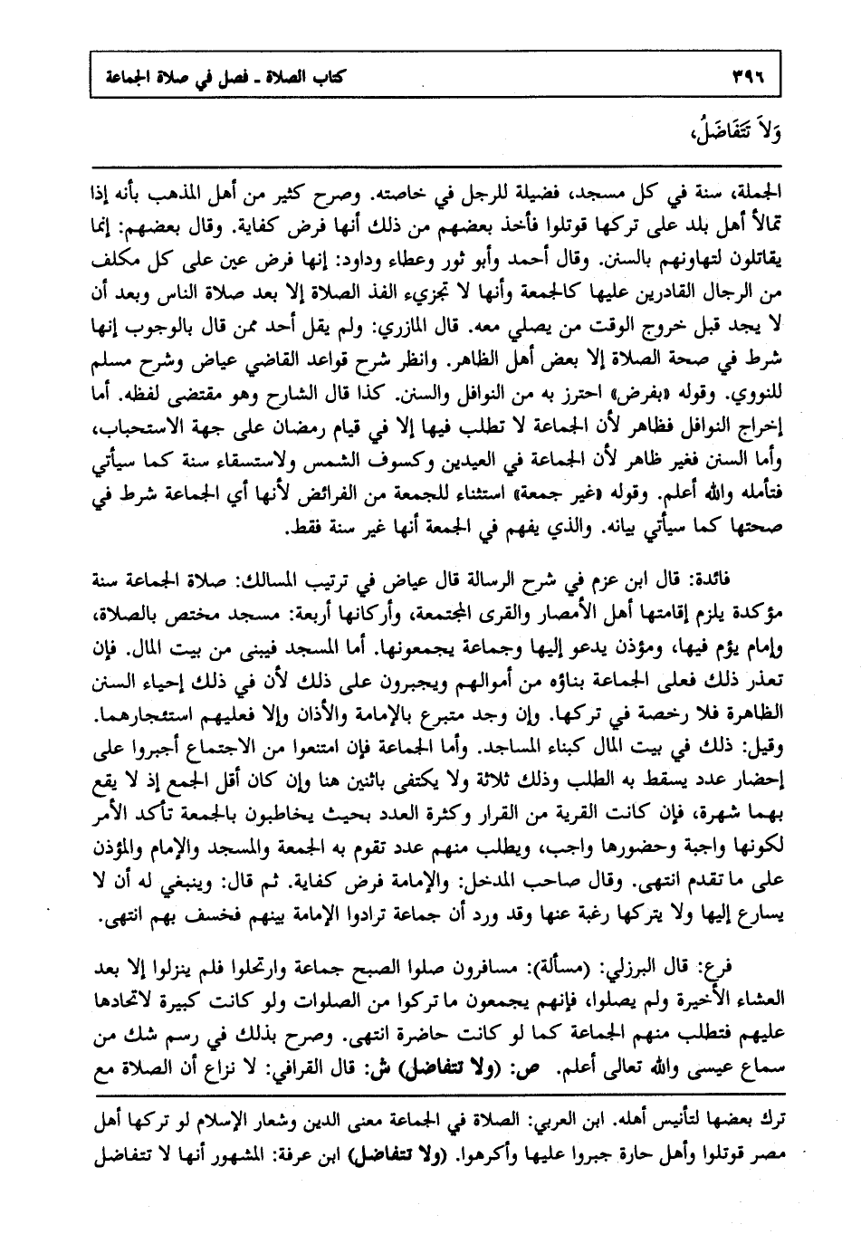 فرع : قال البرزلي مسألة مسافرون صلوا الصبح جماعة وارتحلوا فلم ينزلوا إلا بعد العشاء الأخيرة, ولم يصلوا فإنهم يجمعون ما تركوا من الصلوات, ولو كانت كبيرة لاتحادها عليهم فتطلب منهم الجماعة كما لو كانت حاضرة انتهى. وصرح بذلك في رسم شك من سماع عيسى, والله تعالى أعلم. ص: "ولا تتفاضل" ش: قال القرافي لا نزاع أن الصلاة مع