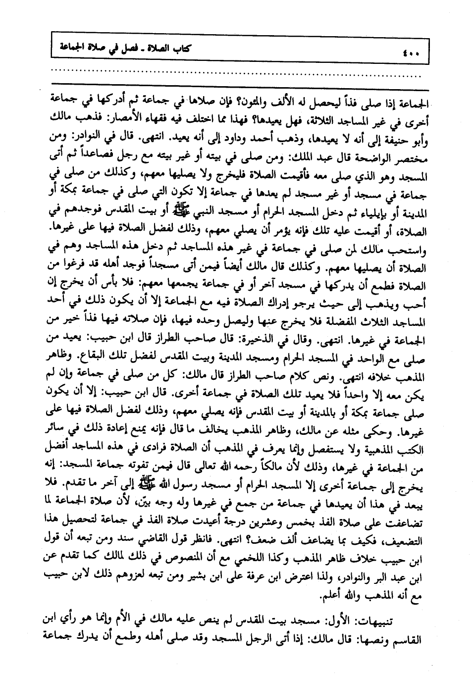 تنبيهات: الأول: مسجد بيت المقدس لم ينص عليه مالك في الأم, وإنما هو رأي ابن القاسم, ونصها قال مالك: إذا أتى الرجل المسجد, وقد صلى أهله, وطمع أن يدرك جماعة