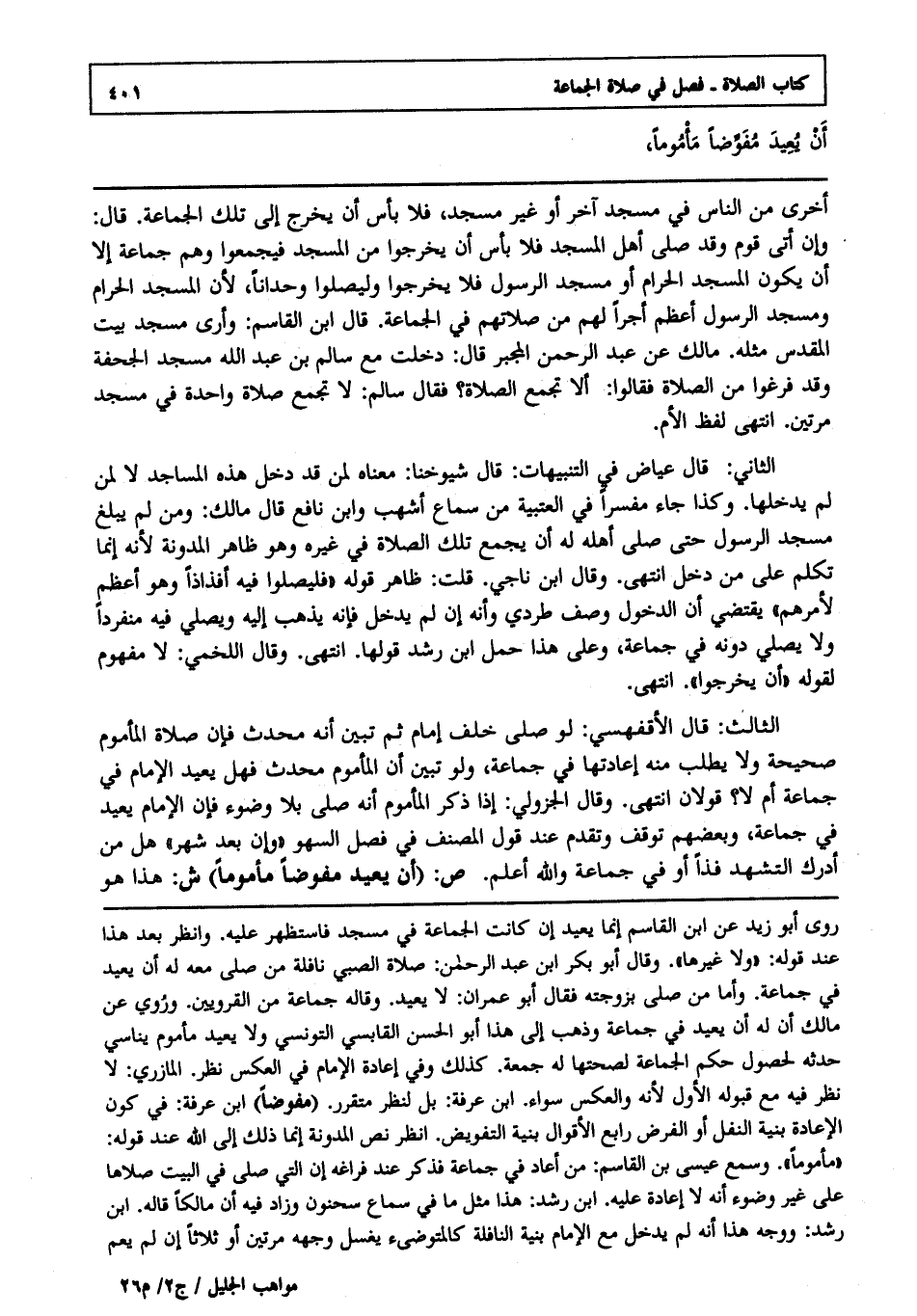 أخرى من الناس في مسجد آخر أو غير مسجد, فلا بأس أن يخرج إلى تلك الجماعة قال, وإن أتى قوم, وقد صلى أهل المسجد, فلا بأس أن يخرجوا من المسجد فيجمعوا, وهم جماعة إلا أن يكون المسجد الحرام أو مسجد الرسول, فلا يخرجوا وليصلوا وحدانا ; لأن المسجد الحرام ومسجد الرسول أعظم أجرا لهم من صلاتهم في الجماعة, قال ابن القاسم وأرى مسجد بيت المقدس مثله مالك عن عبد الرحمن بن المجبر قال دخلت مع سالم بن عبد الله مسجد الجحفة, وقد فرغوا من الصلاة فقالوا: ألا نجمع الصلاة فقال سالم: لا تجمع صلاة واحدة في مسجد مرتين انتهى. لفظ الأم .