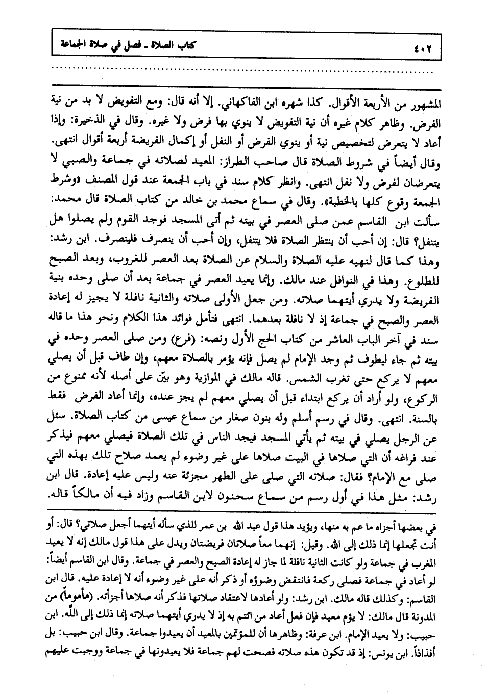 المشهور من الأربعة الأقوال كذا شهره ابن الفاكهاني إلا أنه قال: ومع التفويض لا بد من نية الفرض, وظاهر كلام غيره: أن نية التفويض لا ينوى بها فرض, ولا غيره, وقال في الذخيرة: وإذا أعاد لا يتعرض لتخصيص نية أو ينوي الفرض أو النفل أو إكمال الفريضة أربعة أقوال انتهى. وقال أيضا في شروط الصلاة: قال صاحب الطراز: المعيد لصلاته في جماعة, والصبي لا يتعرضان لفرض, ولا نفل انتهى. وانظر كلام سند في باب الجمعة عند قول المصنف وشرط الجمعة وقوع كلها بالخطبة, وقال في سماع محمد بن خالد من كتاب الصلاة قال محمد: سألت ابن القاسم عمن صلى العصر في بيته ثم أتى المسجد فوجد القوم, ولم يصلوا هل يتنفل ؟ قال: إن أحب أن ينتظر الصلاة, فلا يتنفل, وإن أحب أن ينصرف فلينصرف ابن رشد, وهذا كما قال لنهيه عليه الصلاة والسلام عن الصلاة بعد العصر للغروب وبعد الصبح للطلوع, وهذا في النوافل عند مالك وإنما يعيد العصر في جماعة بعد أن صلى وحده بنية الفريضة, ولا يدري أيتهما صلاته, ومن جعل الأولى صلاته, والثانية نافلة لا يجيز له إعادة العصر والصبح في جماعة ; إذ لا نافلة بعدهما انتهى. فتأمل فوائد هذا الكلام. ونحو هذا ما قاله سند في آخر الباب العاشر من كتاب الحج الأول, ونصه فرع, ومن صلى العصر وحده في بيته ثم جاء ليطوف ثم وجد الإمام لم يصل فإنه يؤمر بالصلاة معهم, وإن طاف قبل أن يصلي معهم لا يركع حتى تغرب الشمس قاله مالك في الموازية, وهو بين على أصله ; لأنه ممنوع من الركوع, ولو أراد أن يركع ابتداء قبل أن يصلي معهم لم يجز عنده وإنما أعاد الفرض فقط بالسنة انتهى. وقال في رسم أسلم وله بنون صغار من سماع عيسى من كتاب الصلاة سئل عن الرجل يصلي في بيته ثم يأتي المسجد فيجد الناس في تلك الصلاة فيصلي معهم فيذكر عند فراغه أن التي صلاها في البيت صلاها على غير وضوء, ولم يعمد صلاح تلك بهذه التي صلى مع الإمام فقال: صلاته التي صلى على الطهر مجزئة عنه, وليس عليه إعادة, قال ابن رشد مثل هذا في أول رسم من سماع سحنون لابن القاسم وزاد فيه أن مالكا قاله