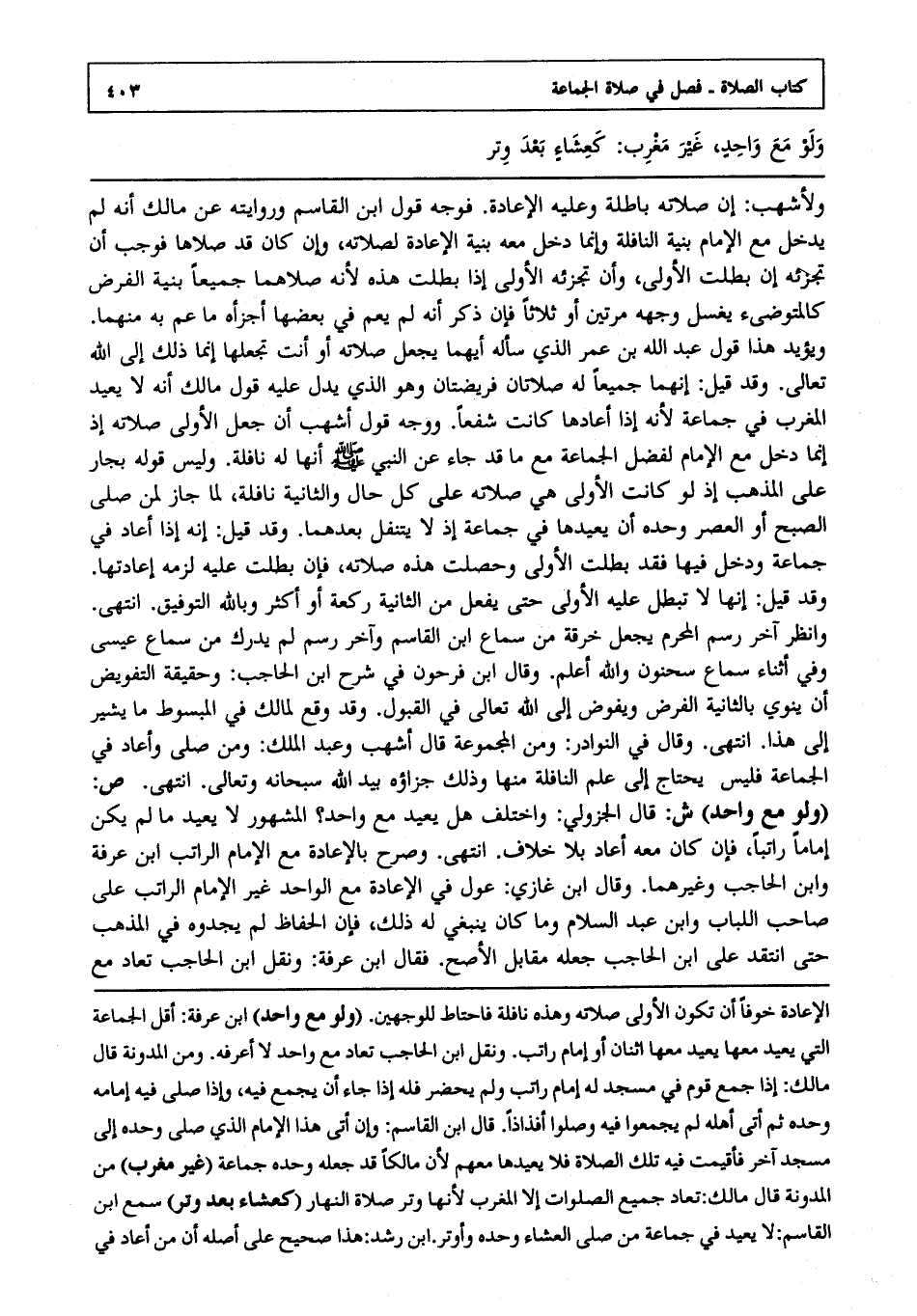ولأشهب أن صلاته باطلة, وعليه الإعادة فوجه قول ابن القاسم وروايته عن مالك أنه لم يدخل مع الإمام بنية النافلة وإنما دخل معه بنية الإعادة لصلاته, وإن كان قد صلاها فوجب أن تجزئه إن بطلت الأولى, وأن تجزئه الأولى إذا بطلت هذه ; لأنه صلاهما جميعا بنية الفرض كالمتوضئ يغسل وجهه مرتين أو ثلاثا, فإن ذكر أنه لم يعم في بعضها أجزأه ما عم به منهما, ويؤيد هذا قول عبد الله بن عمر للذي سأله أيهما يجعل صلاته: أوأنت تجعلها إنما ذلك إلى الله تعالى, وقد قيل: إنهما جميعا له صلاتان فريضتان, وهو الذي يدل عليه قول مالك: إنه لا يعيد المغرب في جماعة ; لأنه إذا أعادها كانت شفعا, ووجه قول أشهب: أن جعل الأولى صلاته إذ إنما دخل مع الإمام لفضل الجماعة مع ما قد جاء عن النبي صلى الله عليه وسلم أنها له نافلة, وليس قوله بجار على المذهب ; إذ لو كانت الأولى هي صلاته على كل حال, والثانية نافلة لما جاز لمن صلى الصبح أو العصر وحده أن يعيدها في جماعة ; إذ لا يتنفل بعدهما, وقد قيل: إنه إذا أعاد في جماعة, ودخل فيها فقد بطلت الأولى, وحصلت هذه صلاته فإن بطلت عليه لزمه إعادتها, وقد قيل: إنها لا تبطل عليه الأولى حتى يفعل من الثانية ركعة أو أكثر, وبالله التوفيق انتهى. وانظر آخر رسم المحرم, ويجعل خرقة من سماع ابن القاسم وآخر رسم لم يدرك من سماع عيسى, وفي أثناء سماع سحنون والله أعلم. وقال ابن فرحون في شرح ابن الحاجب وحقيقة التفويض أن ينوي بالثانية الفرض, ويفوض إلى الله - تعالى - في القبول, وقد وقع لمالك في المبسوط ما يشير إلى هذا انتهى. وقال في النوادر: ومن المجموعة قال أشهب وعبد الملك ومن صلى وأعاد في الجماعة فليس يحتاج إلى علم النافلة منها وذلك جزاؤه بيد الله سبحانه وتعالى انتهى. ص:"ولو مع واحد" ش: قال الجزولي واختلف هل يعيد مع واحد ؟ المشهور لا يعيد ما لم يكن إماما راتبا فإن كان معه أعاد بلا خلاف انتهى. وصرح بالإعادة مع الإمام الراتب ابن عرفة وابن الحاجب وغيرهما, وقال ابن غازي: عول في الإعادة مع الواحد غير الإمام الراتب على صاحب اللباب وابن عبد السلام, وما كان ينبغي له ذلك فإن الحفاظ لم يجدوه في المذهب حتى انتقد على ابن الحاجب جعله مقابل الأصح فقال ابن عرفة ونقل ابن الحاجب تعاد مع