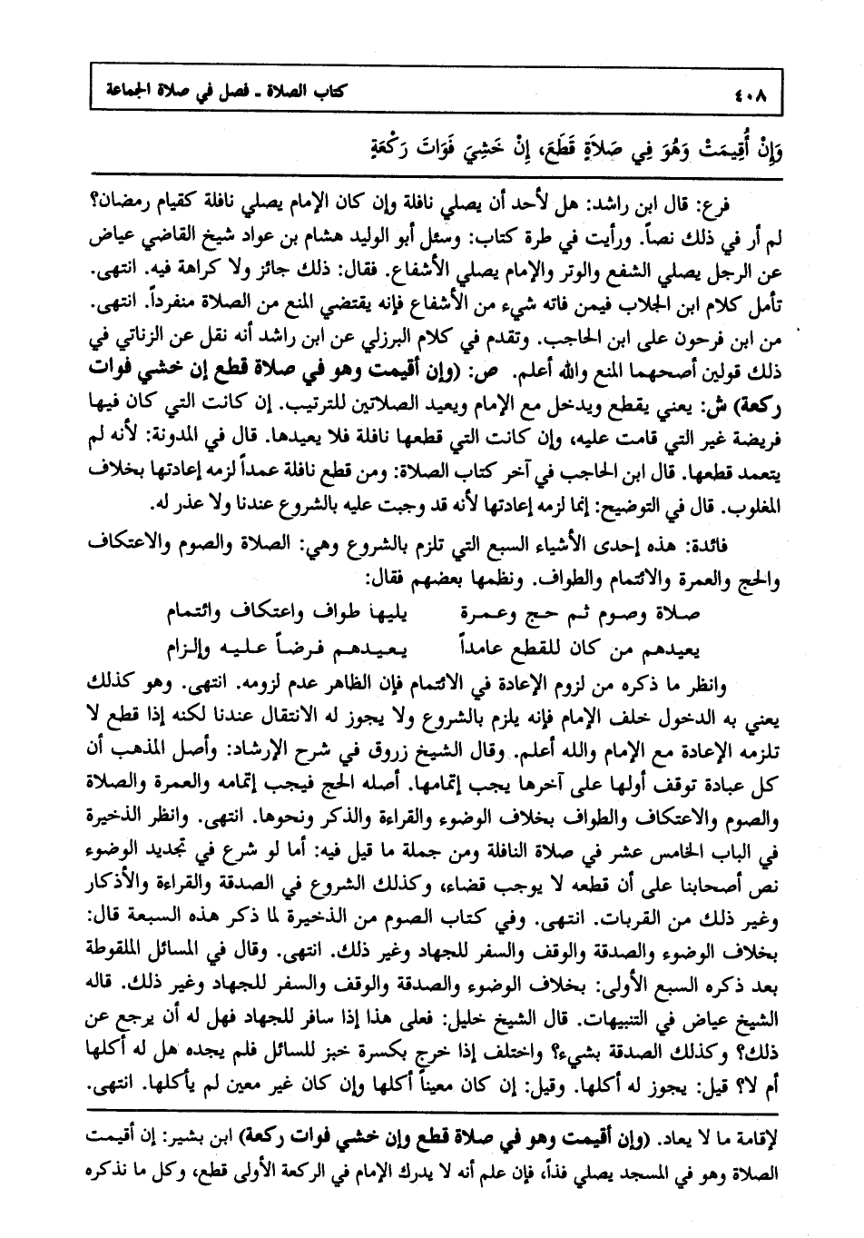فرع : قال ابن راشد هل لأحد أن يصلي نافلة وإن كان الإمام يصلي نافلة كقيام رمضان لم أر في ذلك نصا ورأيت في طرة كتاب وسئل أبو الوليد هشام بن عواد شيخ القاضي عياض عن الرجل يصلي الشفع والوتر, والإمام يصلي الإشفاع, فقال ذلك جائز, ولا كراهة فيه انتهى. تأمل كلام ابن الجلاب فيمن فاته شيء من الإشفاع فإنه يقتضي المنع من الصلاة منفردا انتهى. من ابن فرحون على ابن الحاجب وتقدم في كلام البرزلي عن ابن راشد أنه نقل عن الزناتي في ذلك قولين أصحهما المنع والله أعلم. ص: "وإن أقيمت, وهو في صلاة قطع إن خشي فوات ركعة" ش: يعني يقطع ويدخل مع الإمام ويعيد الصلاتين للترتيب إن كان التي كان فيها فريضة غير التي قامت عليه, وإن كانت التي قطعها نافلة, فلا يعيدها قال في المدونة: لأنه لم يتعمد قطعها, قال ابن الحاجب في آخر كتاب الصلاة: ومن قطع نافلة عمدا لزمه إعادتها بخلاف المغلوب, قال في التوضيح: إنما لزمه إعادتها ; لأنه قد وجبت عليه بالشروع عندنا, ولا عذر له.