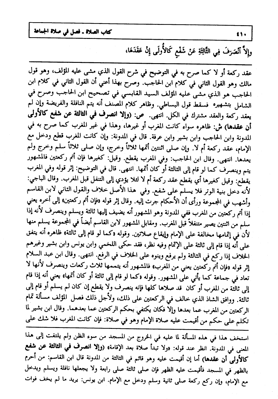 عقد ركعة أو لا كما صرح به في التوضيح في شرح القول الذي مشى عليه المؤلف, وهو قول مالك, وهو القول الثاني في كلام ابن الحاجب وصرح بهذا أعني أن القول الثاني في كلام ابن الحاجب هو الذي مشى عليه المؤلف السيد القابسي في تصحيح ابن الحاجب وصرح في الشامل بتشهيره فسقط قول البساطي, وظاهر كلام المصنف أنه يتم النافلة والفريضة, وإن لم يعقد ركعة والعقد مشترك في الكل انتهى. ص: "وإلا انصرف في الثالثة عن شفع كالأولى إن عقدها" ش: ظاهره سواء كانت المغرب أو غيرها, وهذا في غير المغرب كما صرح به في المدونة وابن الحاجب وابن بشير وابن عرفة قال في المدونة: وإن كانت المغرب قطع ودخل مع الإمام عقد ركعة أم لا, وإن صلى اثنتين أتمها ثلاثا وخرج, وإن صلى ثلاثا سلم وخرج, ولم يعدها انتهى. وقال ابن الحاجب وفي المغرب يقطع, وقيل: كغيرها فإن أتم ركعتين فالمشهور: يتم وينصرف كما لو قام إلى الثالثة أو كان أتمها انتهى. قال في التوضيح أثر قوله: وفي المغرب يقطع, وقيل: كغيرها أي يقطع عقد ركعة أم لا لئلا يؤدي إلى التنفل قبل المغرب, وقال الباجي ; لأنه دخل بنية الوتر, فلا يسلم على شفع, وفي هذا الأصل خلاف, والقول الثاني لابن القاسم وأشهب في المجموعة, ورأى أن الأحكام جرت إليه, وقال إثر قوله: فإن أتم ركعتين إلى آخره يعني إذا أتم ركعتين من المغرب ففي المدونة, وهو المشهور أنه يضيف إليها ثالثة, ويسلم وينصرف ; لأنه إذا سلم من اثنتين يصير متنفلا قبل المغرب, ومقابل المشهور لابن القاسم أيضا في المجموعة يسلم منها ; لأن في إتمامها مخالفة على الإمام وإيقاع صلاتين, وقوله: كما لو قام إلى ثالثة ظاهره: أنه يتفق على أنه إذا قام إلى ثالثة على الإتمام, وفيه نظر فقد حكى اللخمي وابن يونس وابن بشير وغيرهم الخلاف إذا ركع في الثالثة, ولم يرفع وينوه على الخلاف في الرفع انتهى. وقال ابن عبد السلام إثر قوله: فإن أتم ركعتين يعني من المغرب فالمشهور: أنه يتمها ثلاث ركعات, وينصرف ; لأنها لا تعاد في جماعة كما يأتي على المشهور, وقوله: كما لو قام إلى ثالثة, أو كان أتمها يعني إنه إذا قام إلى ثالثة من المغرب, أو كان قد صلاها كلها فإنه ينصرف, ولا يقطع إن كان لم يسلم أو قام إلى ثالثة ووافق الشاذ الذي خالف في الركعتين على ذلك ولأجل ذلك فصل المؤلف مسألة تمام الركعتين من المغرب عما بعدها, وإلا فكان يكتفي بحكم الركعتين عما بعدهما, وقال ابن بشير: لما تكلم على حكم من أقيمت عليه صلاة الإمام, وهو في صلاة فإن كانت المغرب, فلا شك على