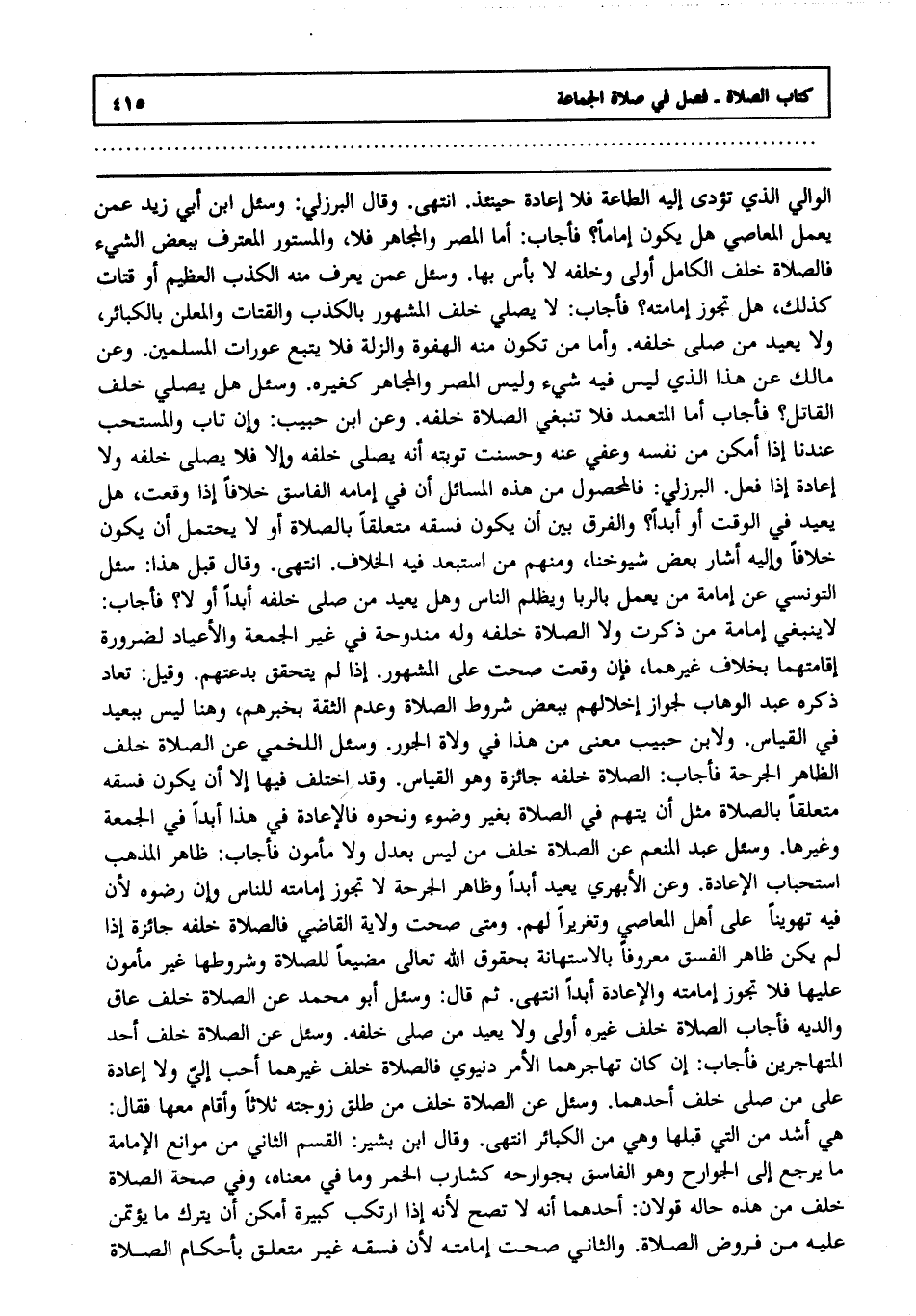 الوالي الذي تؤدى إليه الطاعة, فلا إعادة حينئذ انتهى. وقال البرزلي. وسئل ابن أبي زيد عمن يعمل المعاصي هل يكون إماما ؟ فأجاب أما المصر والمجاهر, فلا والمستور المعترف ببعض الشيء فالصلاة خلف الكامل أولى وخلفه لا بأس بها. وسئل عمن يعرف منه الكذب العظيم أو قتات كذلك هل تجوز إمامته فأجاب لا يصلى خلف المشهور بالكذب والقتات والمعلن بالكبائر, ولا يعيد من صلى خلفه, وأما من تكون منه الهفوة والزلة, فلا يتبع عورات المسلمين وعن مالك من هذا الذي ليس فيه شيء, وليس المصر والمجاهر كغيره. وسئل هل يصلي خلف القاتل ؟ فأجاب: أما المتعمد فلا تنبغي الصلاة خلفه, وعن ابن حبيب, وإن تاب, والمستحب عندنا إذا أمكن من نفسه, وعفي عنه وحسنت توبته أنه يصلي خلفه, وإلا فلا يصلي خلفه, ولا إعادة إذا فعل البرزلي فالحصول من هذه المسائل أن في إمامة الفاسق خلافا إذا وقعت هل يعيد في الوقت أو أبدا, والفرق بين الجمعة وغيرها أو لا إعادة, وهو الظاهر من جل فتاويهم, وهو ظاهر المدونة عند بعضهم, واختار اللخمي الفرق بين أن يكون فسقه متعلقا بالصلاة أو لا يحتمل أن يكون خلافا, وإليه أشار بعض شيوخنا, ومنهم من استبعد فيه الخلاف انتهى., وقال قبل هذا سئل التونسي عن إمامة من يعمل بالربا, ويظلم الناس, وهل يعيد من صلى خلفه أبدا أو لا فأجاب: لا ينبغي إمامة من ذكرت, ولا الصلاة خلفه وله مندوحة في غير الجمعة والأعياد لضرورة إقامتهما بخلاف غيرهما فإن وقعت صحت على المشهور إذا لم يتحقق بدعتهم, وقيل: تعاد, ذكره عبد الوهاب لجواز إخلالهم ببعض شروط الصلاة وعدم الثقة بخبرهم وهنا ليس ببعيد في القياس ولابن حبيب معنى من هذا في ولاة الجور. وسئل اللخمي عن الصلاة خلف الظاهر الجرحة ؟ فأجاب: الصلاة خلفه جائزة, وهو القياس, وقد اختلف فيها إلا أن يكون فسقه متعلقا بالصلاة مثل أن يتهم في الصلاة بغير وضوء ونحوه فالإعادة في هذا أبدا في الجمعة وغيرها. وسئل عبد المنعم عن الصلاة خلف من ليس بعدل, ولا مأمون ؟ فأجاب: ظاهر المذهب: استحباب الإعادة وعن الأبهري يعيد أبدا, وظاهر الجرحة لا تجوز إمامته للناس, وإن رضوه ; لأن فيه تهوينا على أهل المعاصي وتعزيرا لهم ومتى صحت ولاية القاضي فالصلاة خلفه جائزة إذا لم يكن ظاهر الفسق معروفا بالاستهانة بحقوق الله تعالى مضيعا للصلاة وشروطها غير مأمون عليها, فلا تجوز إمامته, والإعادة أبدا انتهى. ثم قال: وسئل أبو محمد عن الصلاة خلف عاق والديه فأجاب: الصلاة خلف غيره أولى, ولا يعيد من صلى خلفه. وسئل عن الصلاة خلف أحد المتهاجرين فأجاب إن كان تهاجرهما لأمر دنيوي, فالصلاة خلف غيرهما أحب إلي, ولا إعادة على من صلى خلف أحدهما. وسئل عن الصلاة خلف من طلق زوجته ثلاثا وأقام معها فقال: هي أشد من التي قبلها, وهي من الكبائر انتهى., وقال ابن بشير القسم الثاني من موانع الإمامة ما يرجع إلى الجوارح, وهو الفاسق بجوارحه كشارب الخمر, وما في معناه, وفي صحة الصلاة خلف من هذه حاله قولان أحدهما أنه لا تصح ; لأنه إذا ارتكب كبيرة أمكن أن يترك ما يؤتمن عليه من فروض الصلاة والثاني صحت إمامته ; لأن فسقه غير متعلق بأحكام الصلاة