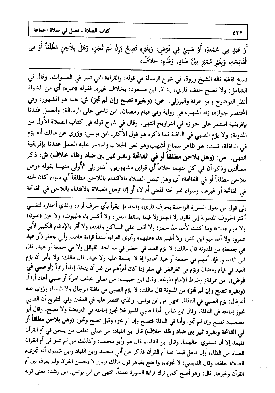 نسخ لفظه, قاله الشيخ زروق في شرح الرسالة في قوله: والقراءة التي تسر في الصلوات, وقال في الشامل: ولا تصح خلف قارئ بشاذ ابن مسعود بخلاف غيره, فقوله: " غيره " أي من الشواذ انظر التوضيح وابن عرفة والبرزلي ص:"وبغيره تصح, وإن لم تجز" ش: هذا هو المشهور, وفي المختصر: جوازه زاد أشهب في رواية, وفي قيام رمضان ابن ناجي على الرسالة, والعمل عندنا بأفريقية استمر على جوازه في التراويح انتهى. وقال في شرح قوله في كتاب الصلاة الأول من المدونة: ولا يؤم الصبي في النافلة فما ذكره هو قول الأكثر ابن يونس, وروى عن مالك أنه يؤم في النافلة قلت: هو ظاهر سماع أشهب, وهو نص الجلاب واستمر عليه العمل عندنا بأفريقية انتهى. ص:"وهل بلاحن مطلقا أو في الفاتحة وبغير مميز بين ضاد وظاء خلاف" ش: ذكر مسألتين, وذكر أن في كل منهما خلافا أي قولين مشهورين أشار إلى الأولى منهما بقوله: وهل بلاحن مطلقا أو في الفاتحة أي: وهل تبطل الصلاة بالاقتداء باللاحن مطلقا أي سواء كان لحنه في الفاتحة أو غيرها, وسواء غير لحنه المعنى أم لا, أو إنما تبطل الصلاة بالاقتداء باللاحن في الفاتحة,