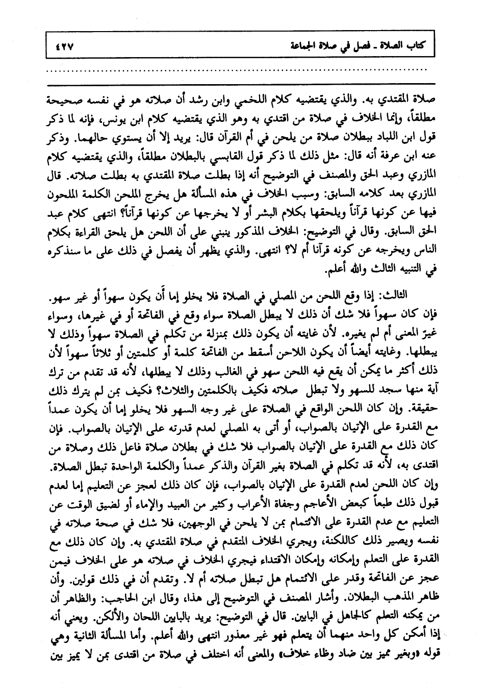 صلاة المقتدي به, والذي يقتضيه كلام اللخمي وابن رشد أن صلاته هو في نفسه صحيحة مطلقا وإنما الخلاف في صلاة من اقتدى به, وهو الذي يقتضيه كلام ابن يونس فإنه لما ذكر قول ابن اللباد ببطلان صلاة من يلحن في أم القرآن, قال: يريد إلا أن يستوي حالهما, وذكر عنه ابن عرفة أنه قال مثل ذلك لما ذكر قول القابسي بالبطلان مطلقا, والذي يقتضيه كلام المازري وعبد الحق والمصنف في التوضيح أنه إذا بطلت صلاة المقتدي به بطلت صلاته, قال المازري بعد كلامه السابق: وسبب الخلاف في هذه المسألة هل يخرج اللحن الكلمة الملحون فيها عن كونها قرآنا ويلحقها بكلام البشر أو لا يخرجها عن كونها قرآنا انتهى. كلام عبد الحق السابق, وقال في التوضيح الخلاف المذكور ينبني على أن اللحن هل يلحق القراءة بكلام الناس ويخرجه عن كونه قرآنا أم لا انتهى. والذي يظهر أن يفصل في ذلك على ما سنذكره في التنبيه الثالث, والله أعلم.