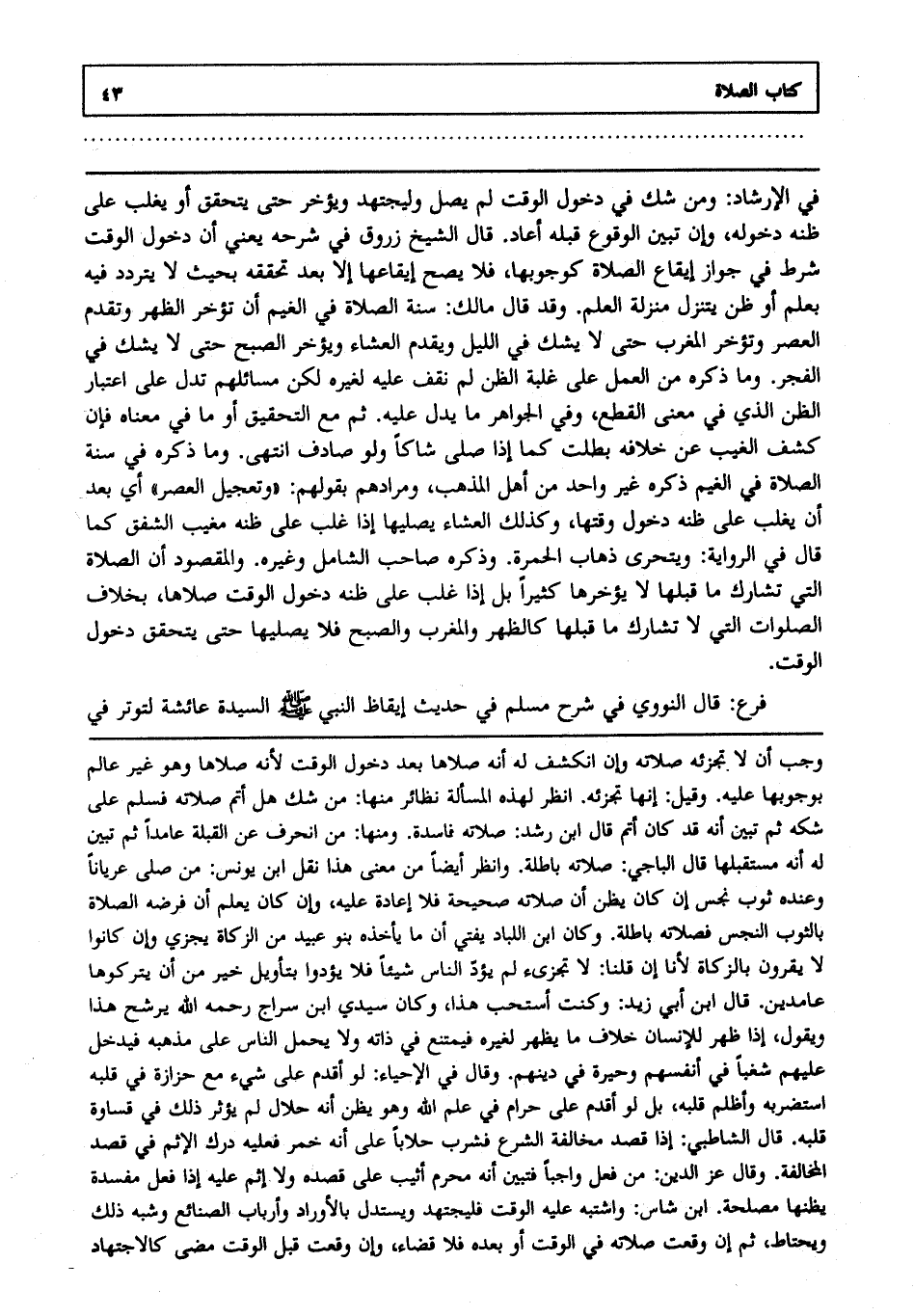 في الإرشاد ومن شك في دخول الوقت لم يصل وليجتهد ويؤخر حتى يتحقق أو يغلب على ظنه دخوله وإن تبين الوقوع قبله أعاد قال الشيخ زروق في شرحه يعني أن الدخول الوقت شرط في جواز إيقاع الصلاة كوجوبها فلا يصح إيقاعها إلا بعد تحققه بحيث لا يتردد فيه بعلم أو ظن يتنزل منزلة العلم وقد قال مالك سنة صلاة في الغيم أن تؤخر الظهر وتقدم العصر وتؤخر المغرب حتى لا يشك في الليل ويقدم العشاء ويؤخر الصبح حتى لا يشك في الفجر وما ذكره من العمل على غلبة الظن لم نقف عليه لغيره لكن مسائلهم تدل على اعتبار الظن الذي في معنى القطع وفي الجوهر ما يدل عليه ثم مع التحقيق أو ما في معناه فإن كشف الغيب عن خلافه بطلت كما إذا صلى شاكا ولو صادف انتهى وما ذكره في سنة الصلاة في الغيم ذكره غير واحد من أهل المذهب ومرادهم بقوله: م وتعجيل العصر أي بعد أن يغلب على ظنه دخول وقتها وكذلك العشاء يصليها إذا غلب على ظنه مغيب الشفق كما قال في الرواية ويتحرى ذهاب الحمرة وذكره صاحب الشامل وغيره والمقصود أن الصلاة التي تشارك ما قبلها لا يؤخرها كثيرا بل إذا غلب على ظنه دخول الوقت صلاها بخلاف الصلوات التي لا تشارك ما قبلها كالظهر والمغرب والصبح فلا يصليها حتى يتحقق دخول الوقت.