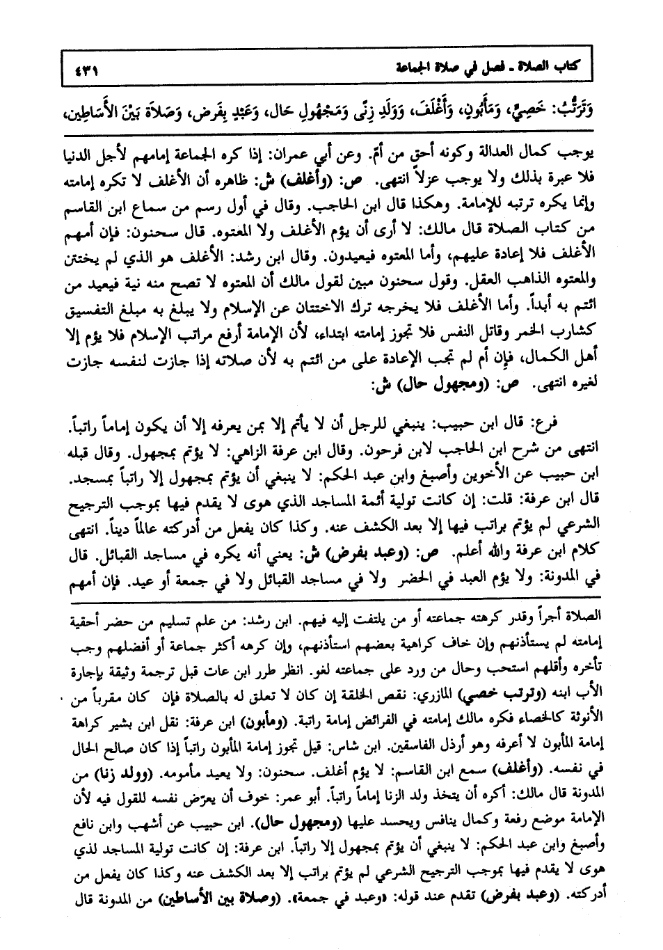 فرع : قال ابن حبيب: ينبغي للرجل أن لا يأتم إلا بمن يعرفه إلا أن يكون إماما راتبا انتهى. من شرح ابن الحاجب لابن فرحون, وقال ابن عرفة الزاهي لا يؤتم بمجهول, وقال قبله ابن حبيب عن الأخوين وأصبغ وابن عبد الحكم لا ينبغي أن يؤتم بمجهول إلا راتبا بمسجد, قال ابن عرفة قلت إن كانت تولية أئمة المساجد لذي هوى لا يقدم فيها بموجب الترجيح الشرعي لم يؤتم براتب فيها إلا بعد الكشف عنه وكذا كان يفعل من أدركته عالما دينا انتهى كلام ابن عرفة, والله أعلم.