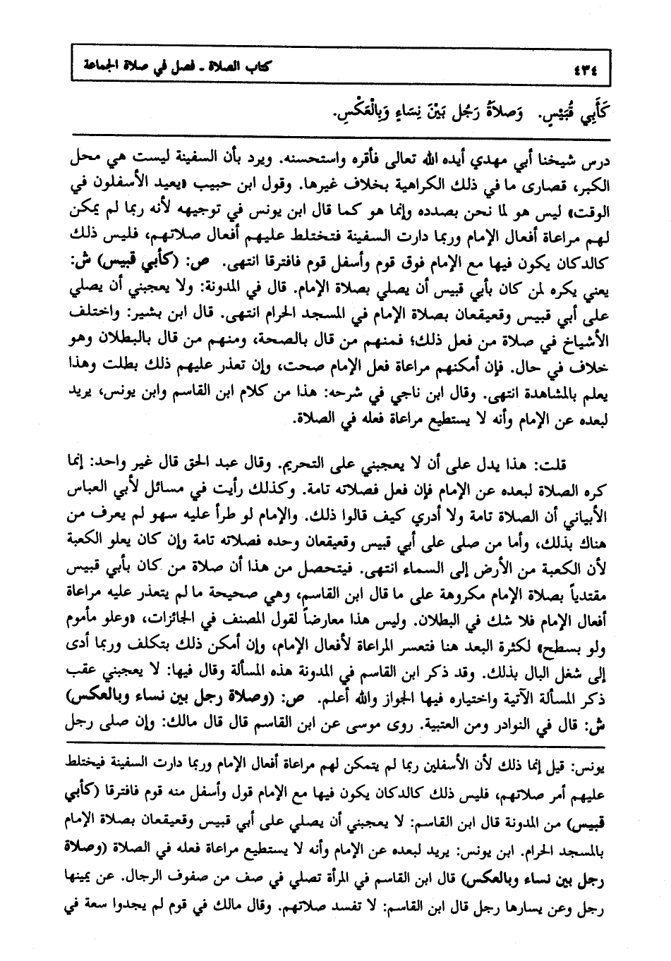 درس شيخنا أبي مهدي - أيده الله تعالى - فأقره واستحسنه ويرد بأن السفينة ليست هي محل الكبر, قصارى ما في ذلك الكراهية بخلاف غيرها, وقول ابن حبيب: يعيد الأسفلون في الوقت ليس هو لما نحن بصدده وإنما هو كما قال ابن يونس في توجيهه ; لأنه ربما لم يمكن لهم مراعاة أفعال الإمام وربما دارت السفينة فتختلط عليهم أفعال صلاتهم فليس ذلك كالدكان يكون فيها مع الإمام فوق, قوم وأسفل قوم فافترقا انتهى.