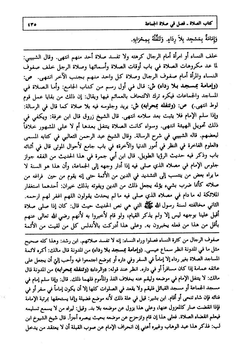 ص: "وإمامة بمسجد بلا رداء" ش: قال في أول رسم من كتاب الجامع, وأما الصلاة في المساجد والجماعات فيكره ترك الالتحاف بالعمائم فيها, ويقال إن ذلك من بقايا عمل قوم لوط انتهى.ص:"وتنفله بمحرابه" ش: يريد وجلوسه فيه بلا صلاة كما قال في الرسالة وإذا سلم الإمام فلا يثبت بعد سلامه انتهى. قال الشيخ زروق قال ابن عرفة ويكفي في ذلك تحويل الهيئة انتهى. وسواء كانت الصلاة يتنفل بعدها أم لا على المشهور خلافا لبعضهم, قاله الشبيبي في شرح الرسالة, وقال الشيخ عبد الرحمن الثعالبي في كتابه المسمى " العلوم الفاخرة في النظر في أمور الدنيا والآخرة في باب جامع لأحوال الموتى, قال في أثنائه - باب - وذكر فيه حديث الرؤيا الطويل, قال ابن أبي جمرة: في هذا الحديث من الفقه جواز جلوس الإمام في مصلاه الذي صلى فيه إذا أدار وجهه إلى الجماعة وإن هذا هو السنة لا ما يراه بعض من ينتسب إلى التشديد في الدين من الأئمة حتى إنه يقوم من حين فراغه من صلاته كأنما ضرب بشيء يؤلمه يجعل ذلك من الدين ويفوته بذلك خيران: - أحدهما استغفار الملائكة له ما دام في مصلاه الذي صلى فيه ما لم يحدث يقولون: اللهم اغفر له اللهم ارحمه - الثاني مخالفته لسنة رسول الله صلى الله عليه وسلم التي هي نص الحديث حيث قال كان إذا صلى صلاة أقبل علينا بوجهه ليس إلا ولم يذكر القيام, ولو قام لأخبروا به ; لأنهم رضي الله تعالى عنهم بأقل من هذا من فعله يخبرون به وعلى هذا أدركت بالأندلس كل من لقيت من الأئمة