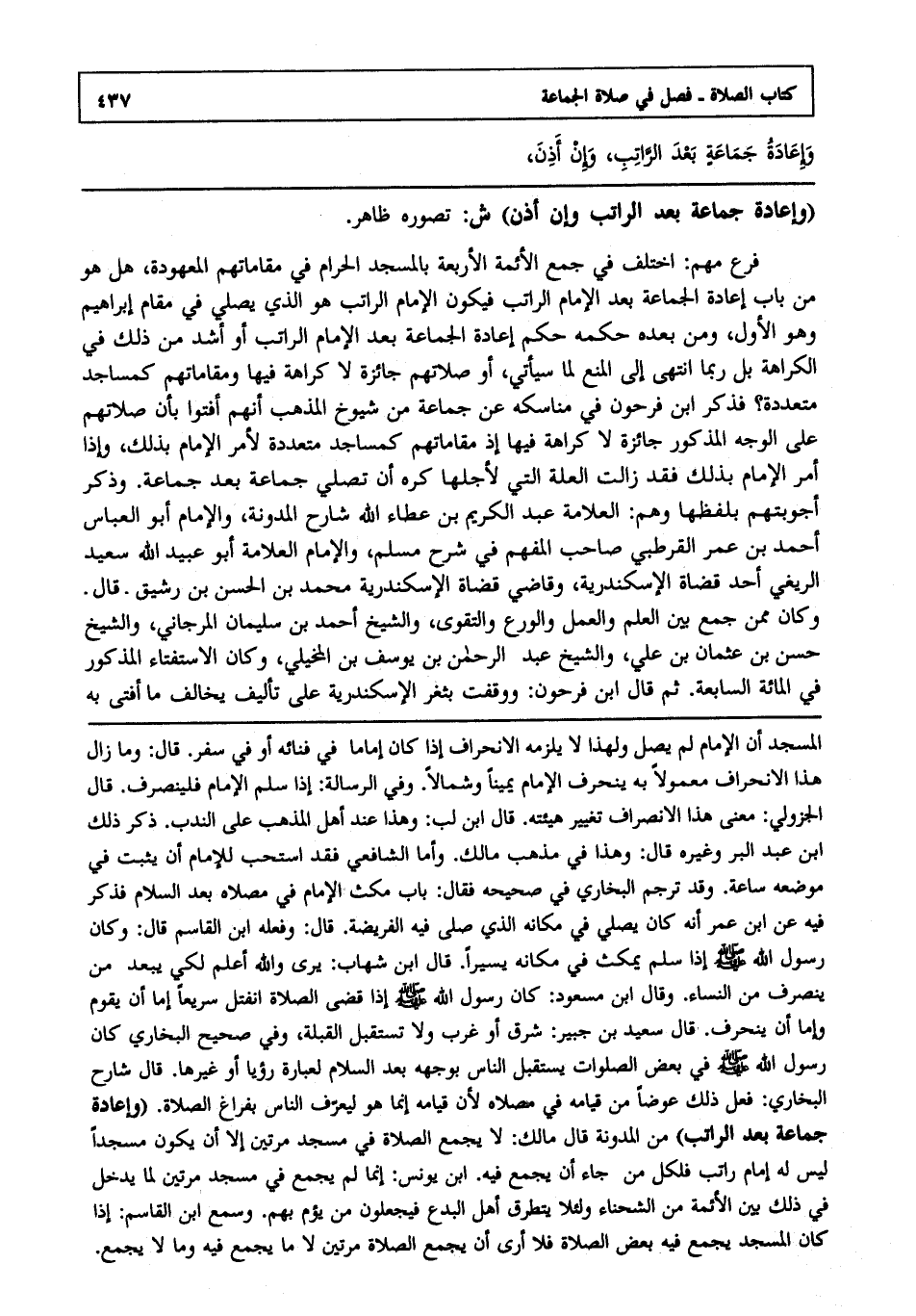 فرع : مهم اختلف في جمع الأئمة الأربعة بالمسجد الحرام في مقاماتهم المعهودة هل هو من باب إعادة الجماعة بعد الإمام الراتب فيكون الإمام الراتب هو الذي يصلي في مقام إبراهيم, وهو الأول ومن بعده حكمه حكم إعادة الجماعة بعد الإمام الراتب أو أشد من ذلك في الكراهة بل ربما انتهى إلى المنع لما سيأتي, أو صلاتهم جائزة لا كراهة فيها ومقاماتهم كمساجد متعددة فذكر ابن فرحون في مناسكه عن جماعة من شيوخ المذهب أنهم أفتوا بأن صلاتهم على الوجه المذكور جائزة لا كراهة فيها إذ مقاماتهم كمساجد متعددة لأمر الإمام بذلك وإذا أمر الإمام بذلك فقد زالت العلة التي لأجلها كره أن تصلي جماعة بعد جماعة, وذكر أجوبتهم بلفظها وهم العلامة عبد الكريم بن عطاء الله شارح المدونة والإمام أبو العباس أحمد بن عمر القرطبي صاحب المفهم في شرح مسلم والإمام العلامة أبو عبد الله سعيد الربعي أحد قضاة الإسكندرية وقاضي قضاة الإسكندرية محمد بن الحسن بن رشيق, قال وكان ممن جمع بين العلم والعمل والورع والتقوى, والشيخ أحمد بن سليمان المرجاني والشيخ حسن بن عثمان بن علي والشيخ عبد الرحمن بن يوسف بن المخيلي, وكان الاستفتاء المذكور في المائة السابعة ثم قال ابن فرحون: ووقفت بثغر الإسكندرية على تأليف يخالف ما أفتى به
