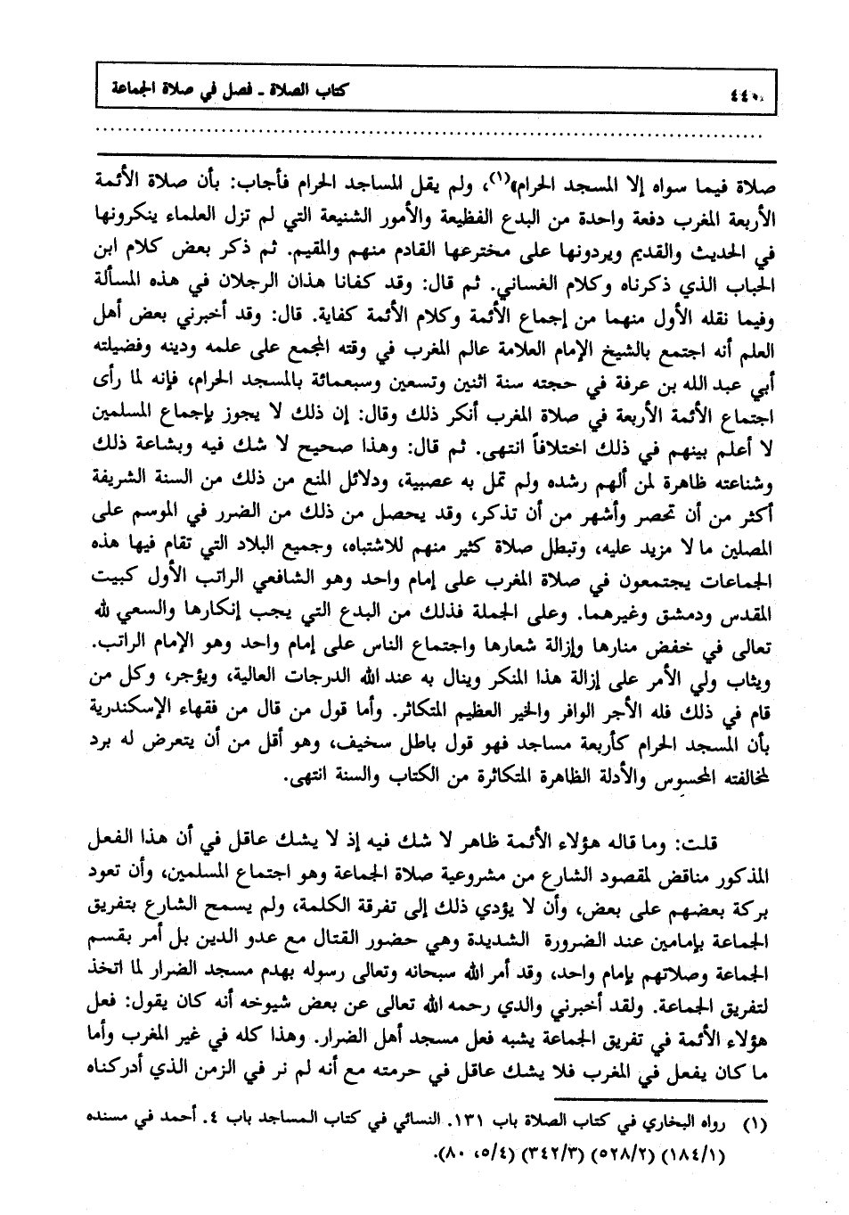قلت: وما قاله هؤلاء الأئمة ظاهر لا شك فيه إذ لا يشك عاقل في أن هذا الفعل المذكور مناقض لمقصود الشارع من مشروعية صلاة الجماعة, وهو اجتماع المسلمين وأن تعود بركة بعضهم على بعض وأن لا يؤدي ذلك إلى تفرق الكلمة ولم يسمح الشارع بتفريق الجماعة بإمامين عند الضرورة الشديدة وهي حضور القتال مع عدو الدين بل أمر بقسم الجماعة وصلاتهم بإمام واحد, وقد أمر الله - سبحانه وتعالى - رسوله بهدم مسجد الضرار لما اتخذ لتفريق الجماعة, ولقد أخبرني والدي - رحمه الله تعالى - عن بعض شيوخه أنه كان يقول: فعل هؤلاء الأئمة في تفريق الجماعة يشبه فعل مسجد أهل الضرار, وهذا كله في غير المغرب, وأما ما كان يفعل في المغرب فلا يشك عاقل في حرمته مع أنه لم نر في الزمن الذي أدركناه