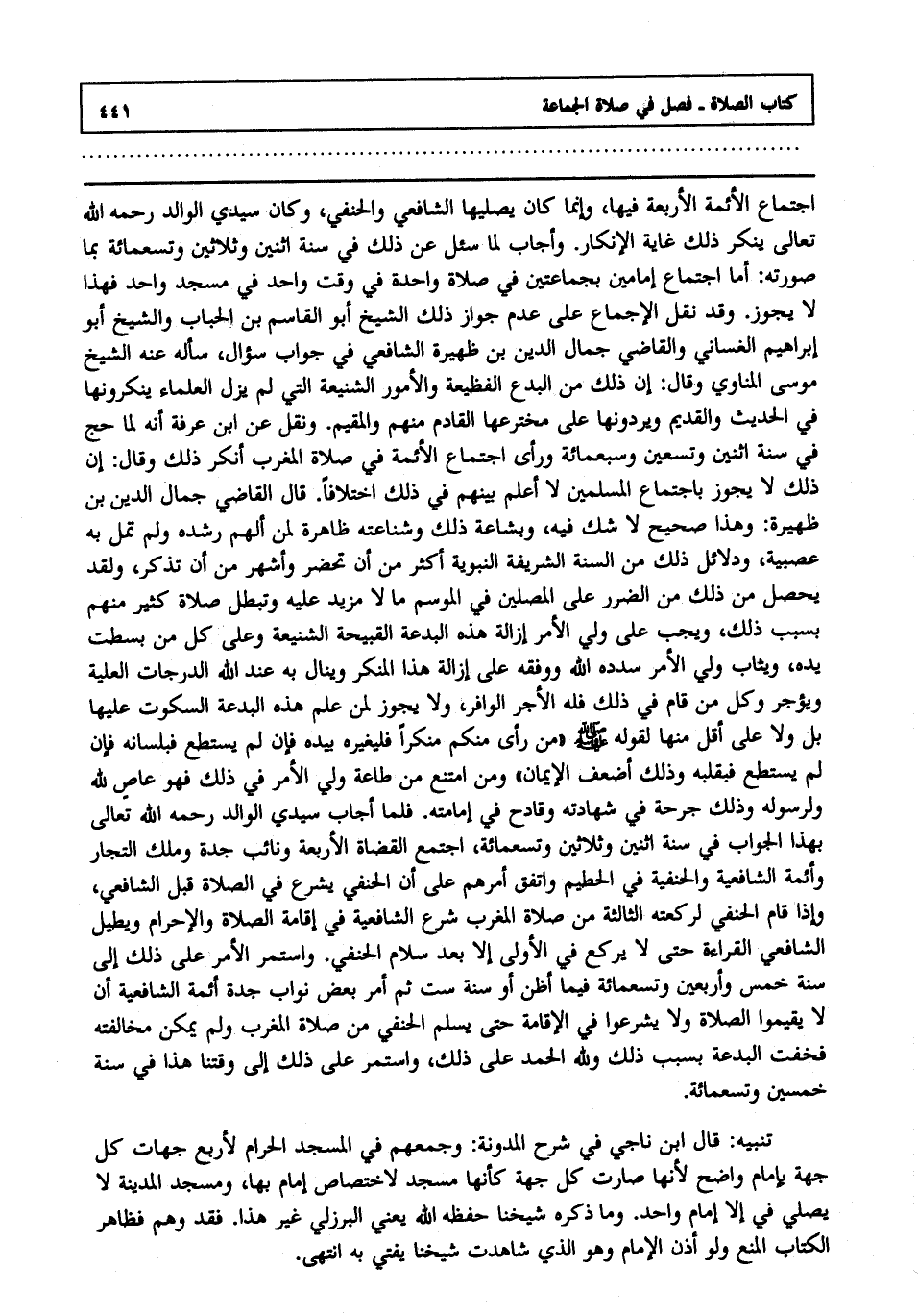تنبيه : قال ابن ناجي في شرح المدونة: وجمعهم في المسجد الحرام لأربع جهات كل جهة بإمام واضح ; لأنها صارت كل جهة كأنها مسجد لاختصاص إمام بها, ومسجد المدينة لا يصلي فيه إلا إمام واحد, وما ذكره شيخنا - حفظه الله - يعني البرزلي غير هذا فقد وهم فظاهر الكتاب المنع, ولو أذن الإمام, وهو الذي شاهدت شيخنا يفتي به انتهى.