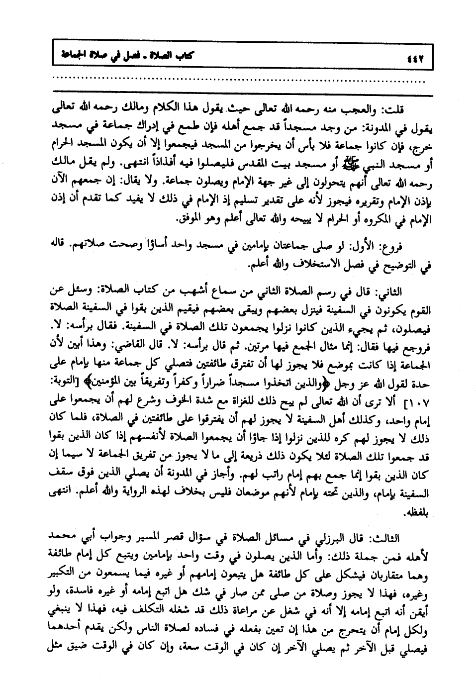 الثاني : قال في رسم الصلاة الثاني من سماع أشهب من كتاب الصلاة وسئل عن القوم يكونون في السفينة فينزل بعضهم ويبقى بعضهم فيقيم الذين بقوا في السفينة الصلاة فيصلون, ثم يجيء الذين كانوا نزلوا يجمعون تلك الصلاة في السفينة فقال برأسه لا, فروجع فيها فقال: إنما مثال الجمع فيها مرتين, ثم قال برأسه لا, قال القاضي, وهذا أبين ; لأن الجماعة إذا كانت بموضع فلا يجوز لها أن تفترق في طائفتين فتصلي كل جماعة منها بإمام على حدة لقول الله عز وجل: {وَالَّذِينَ اتَّخَذُوا مَسْجِداً ضِرَاراً وَكُفْراً وَتَفْرِيقاً بَيْنَ الْمُؤْمِنِينَ} (التوبة: من الآية107) ألا ترى أن الله تعالى لم يبح ذلك للغزاة مع شدة الخوف وشرع لهم أن يجمعوا على إمام واحد, وكذلك أهل السفينة لا يجوز لهم أن يفترقوا على طائفتين في الصلاة فلما كان ذلك لا يجوز لهم كره للذين نزلوا إذا جاءوا أن يجمعوا الصلاة لأنفسهم إذا كان الذين بقوا قد جمعوا تلك الصلاة لئلا يكون ذلك ذريعة إلى ما لا يجوز من تفرق الجماعة لا سيما إن كان الذين بقوا إنما جمع بهم إمام راتب لهم وأجاز في المدونة أن يصلي الذين فوق سقف السفينة بإمام والذين تحته بإمام ; لأنهما موضعان فليس بخلاف لهذه الرواية والله أعلم انتهى بلفظه.