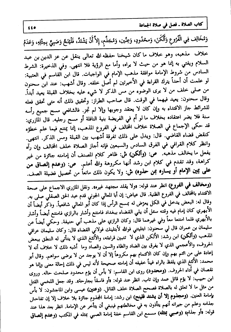 خلاف مذهبه, وهو خلاف ما كان شيخنا حفظه الله تعالى ينقل عن عز الدين بن عبد السلام ويفتي به إنما هو من حيث لا يراه, وأما مع الرؤية فلا انتهى. وفي الذخيرة والشرط السادس من شروط الإمامة موافقة مذهب الإمام في الواجبات, قال ابن القاسم في العتبية لو علمت أن أحدا يترك القراءة في الأخيرتين لم أصل خلفه, وقال أشهب عند ابن سحنون من صلى خلف من لا يرى الوضوء من مس الذكر لا شيء عليه بخلاف القبلة يعيد أبدا, وقال سحنون: يعيد فيهما في الوقت, قال صاحب الطراز: وتحقيق ذلك أنه متى تحقق فعله للشرائط جاز الاقتداء به, وإن كان لا يعتقد وجوبها, وإلا لم تجز فالشافعي مسح جميع رأسه سنة فلا يضر اعتقاده بخلاف ما لو أم في الفريضة بنية النافلة أو مسح رجليه, قال المازري: قد حكى الإجماع في الصلاة خلف المخالف في الفروع المذهب, وإنما يمتنع فيما علم خطؤه كنقض قضاء القاضي, قال ويدل على ذلك تفرقة أشهب بين القبلة ومس الذكر انتهى. وانظر كلام القرافي في الفرق السادس والسبعين فإنه أجاز الصلاة خلف المخالف, وإن رآه يفعل ما يخالف مذهبه. ص: "وألكن" ش: ظاهر كلام المصنف أن إمامته جائزة من غير كراهة, وقد تقدم في كلام ابن رشد أنها مكروهة, والله أعلم.