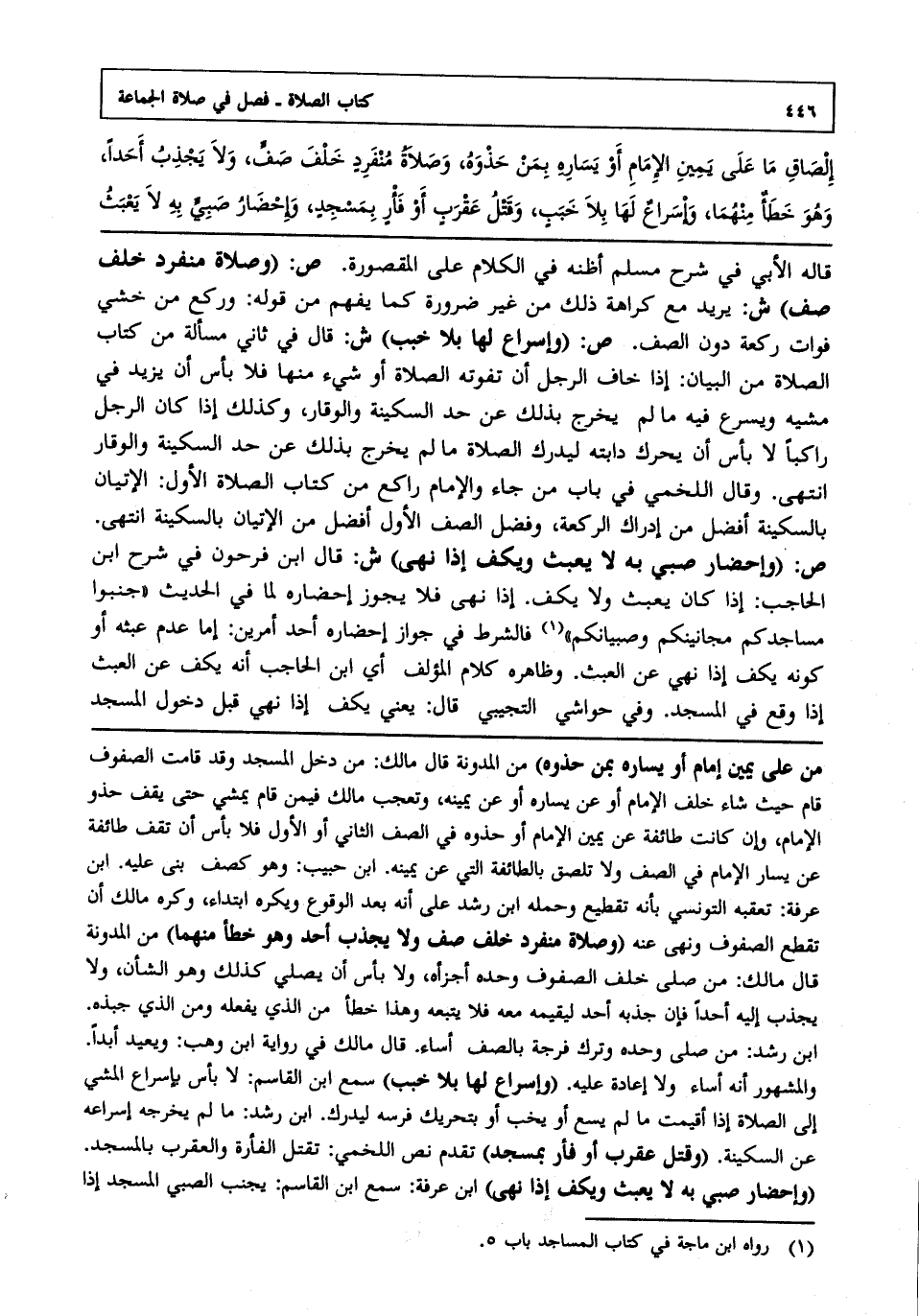 قاله الأبي في شرح مسلم أظنه في الكلام على المقصورة. ص:"وصلاة منفرد خلف صف" ش: يريد مع كراهة ذلك من غير ضرورة كما يفهم من قوله: وركع من خشي فوات ركعة دون الصف المسألة وكما يفهم من كلام ابن رشد على هذه المسألة وعلى من ركع دون الصف. ص:"وإسراع لها بلا خبب" ش: قال في ثاني مسألة من كتاب الصلاة من البيان إذا خاف الرجل أن تفوته الصلاة أو شيء منها فلا بأس أن يزيد في مشيه ويسرع فيه ما لم يخرج بذلك عن حد السكينة والوقار, وكذلك إذا كان الرجل راكبا فلا بأس أن يحرك دابته ليدرك الصلاة ما لم يخرج بذلك عن حد السكينة والوقار انتهى. وقال اللخمي في باب من جاء والإمام راكع من كتاب الصلاة الأول: الإتيان بالسكينة أفضل من إدراك الركعة وفضل الصف الأول أفضل من الإتيان بالسكينة انتهى.