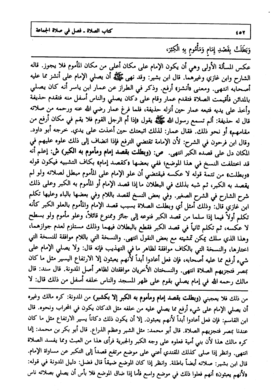 عكس المسألة الأولى وهي أن يكون الإمام على مكان أعلى من مكان المأموم فلا يجوز قاله الشارح وابن غازي وغيرهما قال ابن بشير, وقد نهى صلى الله عليه وسلم أن يصلي الإمام على أنشز مما عليه أصحابه انتهى, ومعنى أنشز أرفع, وذكر في الطراز عن عمار بن ياسر أنه كان يصلي بالمدائن فأقيمت الصلاة فتقدم عمار وقام على دكان يصلي والناس أسفل منه فتقدم حذيفة وأخذ على يديه فتبعه عمار حين أنزله حذيفة فلما فرغ عمار رضي الله عنه ورحمه من صلاته قال له حذيفة ألم تسمع رسول الله صلى الله عليه وسلم يقول إذا أم الرجل القوم فلا يقم في مكان أرفع من مقامهم - أو نحو ذلك - فقال عمار لذلك اتبعتك حين أخذت على يدي خرجه أبو داود, وقال ابن فرحون في الشرح ; لأن الإمامة تقتضي الترفع فإذا انضاف إلى ذلك علوه عليهم في المكان دل على قصده الكبر انتهى. ص: "وبطلت بقصد إمام ومأموم به الكبر" ش: اعلم أنه قد اختلفت النسخ في هذا الموضع ففي بعضها كقصد إمام بكاف التشبيه فيكون قوله وبطلت من تتمة قوله " لا عكسه " فيقتضي أن علو الإمام على المأموم مبطل لصلاته, ولو لم يقصد به الكبر, ثم شبه بذلك في البطلان ما إذا قصد الإمام أو المأموم به الكبر وعلى ذلك شرح الشارح في الشرح الصغير وفي بعض النسخ لقصد باللام وفي بعضها بالباء وعليها تكلم ابن غازي, قال وذلك أمثل أي وبطلت الصلاة بسبب قصد الإمام والمأموم بالعلو الكبر كأنه تكلم أولا فيما إذا سلما من قصد الكبر فنوعه إلى جائز وممنوع قائلا وعلو مأموم, ولو بسطح لا عكسه, ثم تكلم ثانيا في قصد الكبر فقطع بالبطلان فيهما وذلك مستلزم لعدم جوازهما, وهذا الذي سلك يمكن تمشيته مع بعض النقول انتهى. والنسخة التي باللام موافقة للنسخة التي اختارها والنسخة التي بالكاف موافقة لظاهر ما في التهذيب فإنه قال ولا يصلي الإمام على شيء أرفع مما عليه أصحابه, فإن فعل أعادوا أبدا ; لأنهم يعبثون إلا الارتفاع اليسير مثل ما كان بمصر فتجزيهم الصلاة انتهى. والنسختان الأخريان موافقتان لظاهر أصل المدونة قال سند, قال مالك - رحمه الله - في إمام يصلي بقوم على ظهر المسجد والناس خلفه أسفل من ذلك قال لا