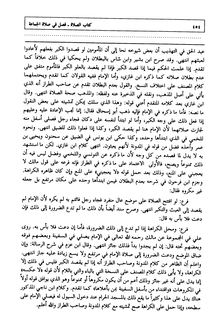 عبد الحق في التهذيب أن بعض شيوخه نحا إلى أن المأمومين لو قصدوا الكبر بفعلهم لأعادوا لعبثهم انتهى, وقد صرح ابن بشير وابن شاس بالبطلان. ولم يحكيا في ذلك خلافا كما تقدم إذا علمت الحكم فيما إذا قصدا الكبر فإذا لم يقصد بالعلو الكبر فالمأموم متفق على عدم بطلان صلاته كما ذكره ابن غازي, وأما الإمام ففيه القولان كما تقدم ويحتملهما كلام المصنف على اختلاف النسخ والقول بعدم البطلان تقدم عن صاحب الطراز أنه الذي يأتي على أصل المذهب, ونقله في الذخيرة عنه ولفظه والمذهب صحة الصلاة انتهى. وقال ابن غازي بعد كلامه المتقدم أعني قوله: وهذا الذي سلك يمكن تمشيته على بعض النقول ما نصه, فأما ما ذكره في, الإمام فإليه ذهب أبو إسحاق فقال إنما تجب الإعادة عليه وعليهم إذا فعل ذلك على وجه الكبر. وأما لو ابتدأ لنفسه على دكان فجاء رجل فصلى أسفل منه لجازت صلاتهما ; لأن الإمام هنا لم يقصد الكبر وكذا إذا فعلوا ذلك للضيق انتهى, ونحوه للخمي في الذي ابتدأها وحده وكذا حكى ابن يونس في الضيق عن سحنون ويحيى بن عمر وأخذه فضل من قوله في المدونة ; لأنهم يعبثون انتهى كلام ابن غازي لكن ما استشهد به لا يدل لما قصده من كل وجه ; لأن ما ذكره عن التونسي واللخمي وفضل ليس فيه أن ذلك ممنوعا ويصح فالأولى الاعتماد على ما ذكره في الطراز فإنه فرعه على قول مالك لا يعجبني على المنع وذلك بعد حمل قوله لا يعجبني على المنع, وإن كان ظاهره الكراهة وجزم ابن فرحون في شرحه بعدم البطلان فيمن ابتدأها وحده على مكان مرتفع بل جعله غير مكروه فقال.